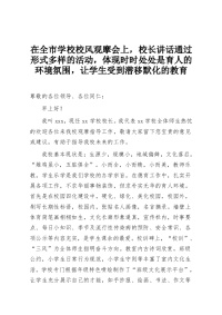 在全市学校校风观摩会上,校长讲话通过形式多样的活动,体现时时处处是育人的环境氛围,让学生受到潜移默化的教育