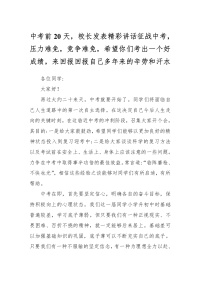 中考前20天,校长发表精彩讲话征战中考,压力难免,竞争难免,希望你们考出一个好成绩,来回报回报自己多年来的辛劳和汗水