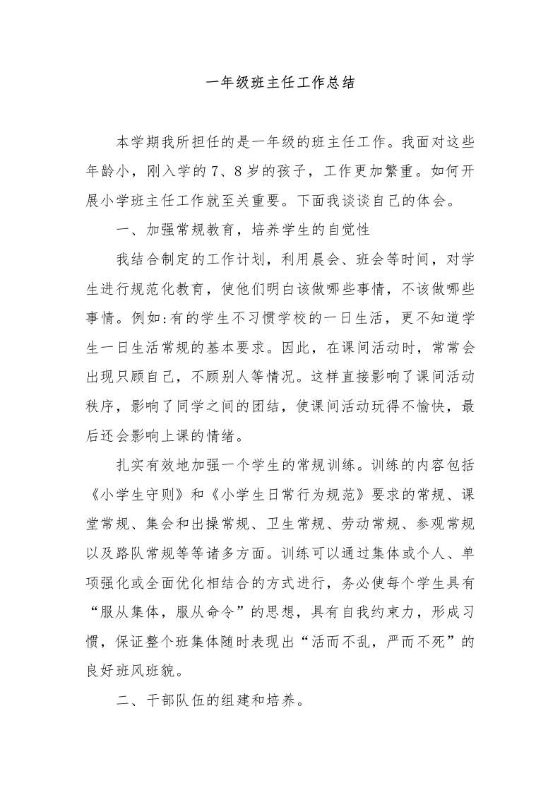 一年级班主任工作总结
