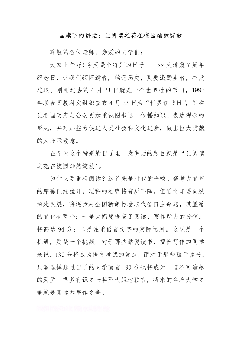 国旗下的讲话:让阅读之花在校园灿然绽放[推荐]