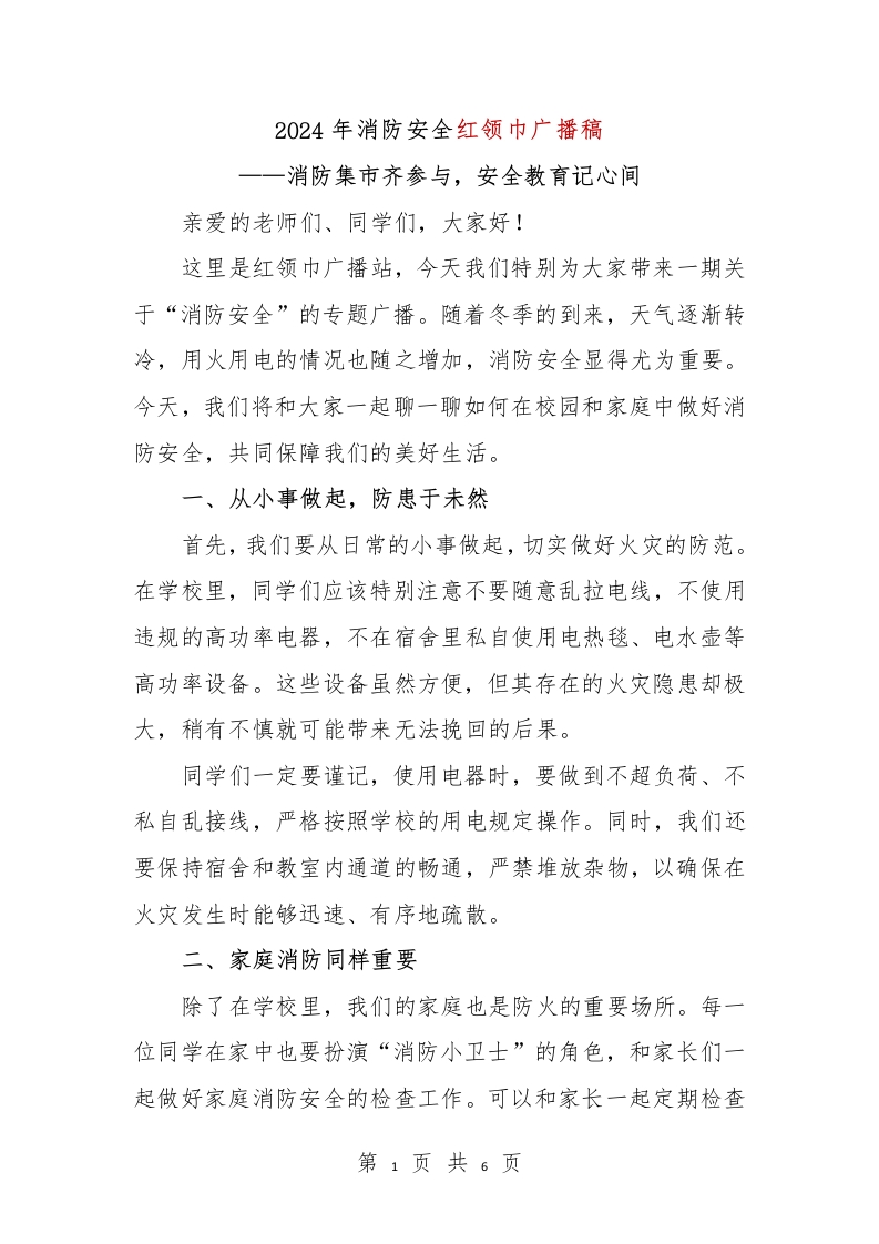 首页少队资料活动方案2024年消防安全红领巾广播稿
