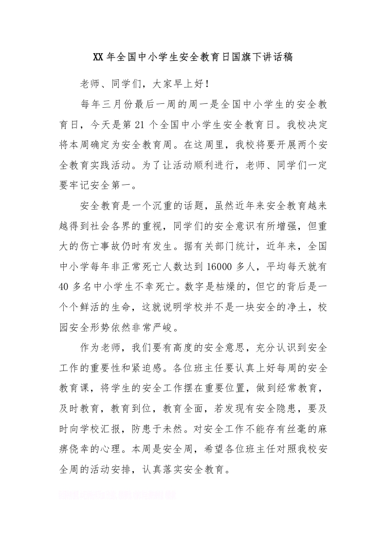 XX年全国中小学生安全教育日国旗下讲话稿[推荐]