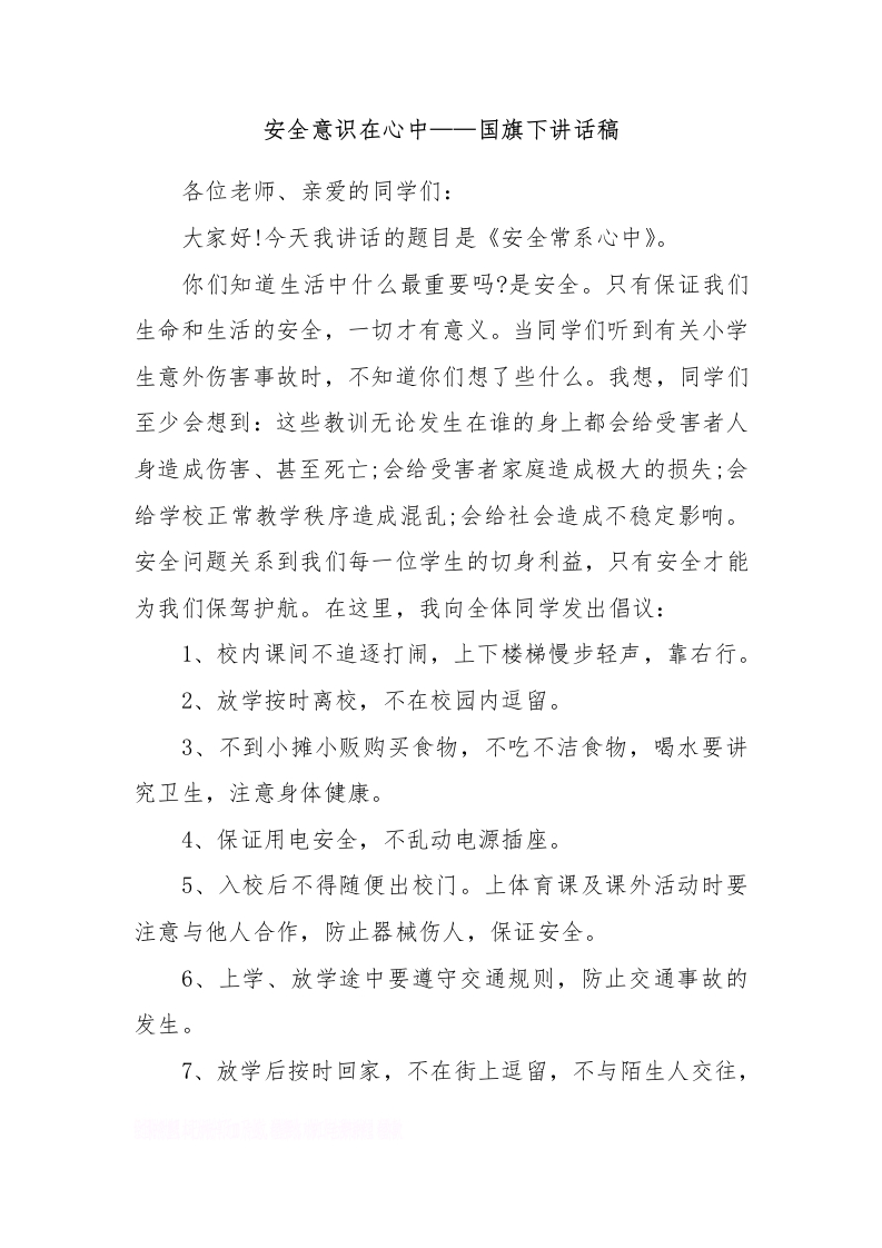 安全意识在心中——国旗下讲话稿[推荐]