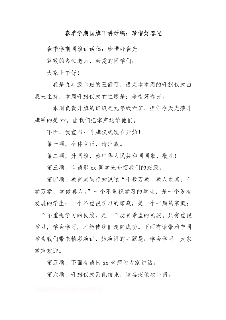 春季学期国旗下讲话稿:珍惜好春光[推荐]