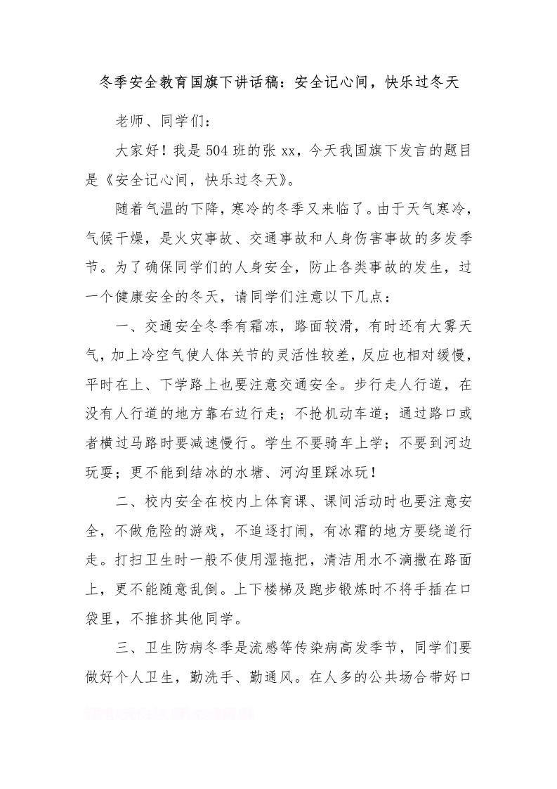 冬季安全教育国旗下讲话稿:安全记心间,快乐过冬天[推荐]
