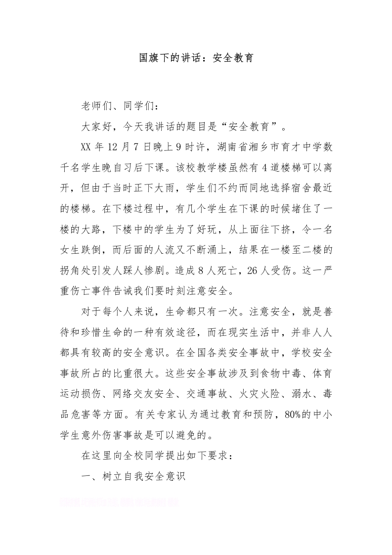 首页主题节日主题活动国旗下的讲话:安全教育[推荐]