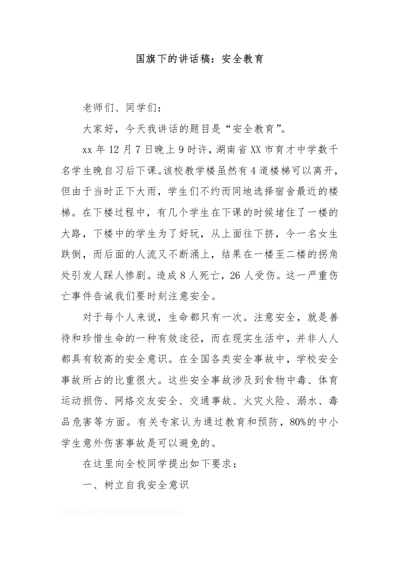 首页主题节日主题活动国旗下的讲话稿:安全教育_1[推荐]
