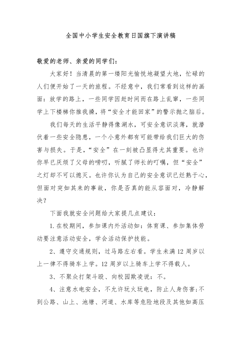 全国中小学生安全教育日国旗下演讲稿(1)