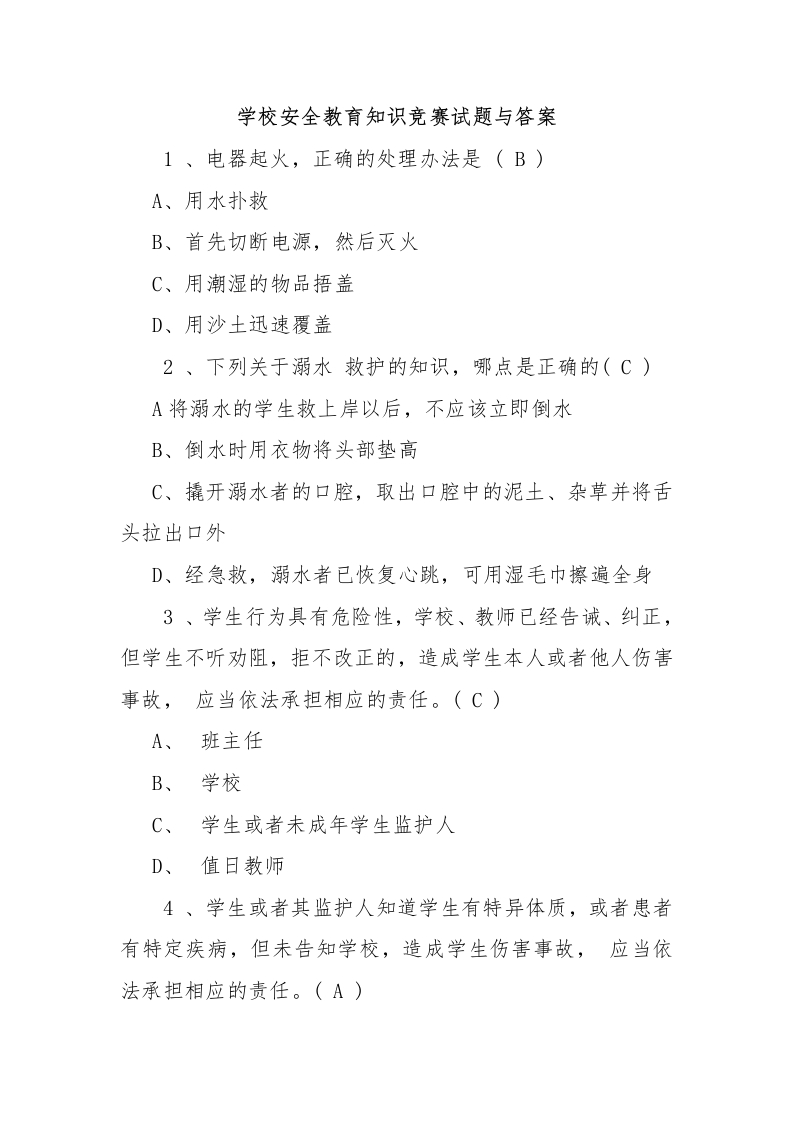 首页主题节日主题活动学校安全教育知识竞赛试题与答案
