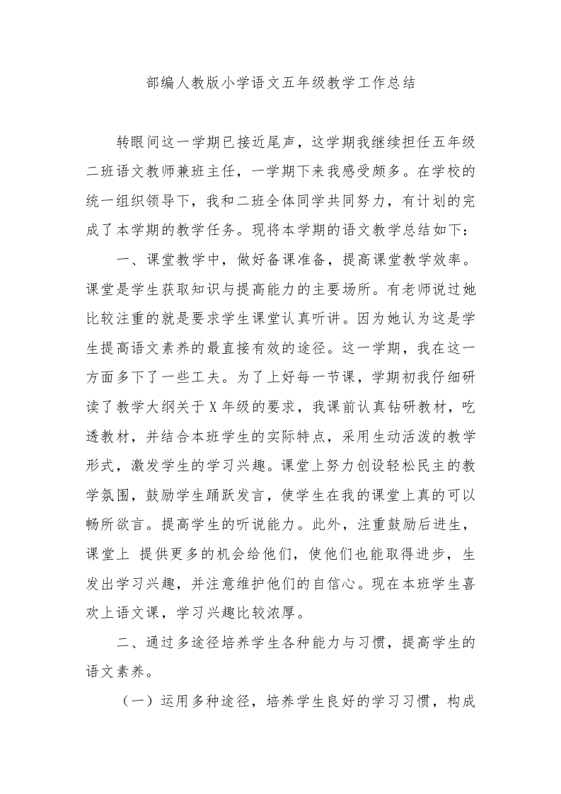 首页班主任资料计划总结部编版五年级下册语文教学工作总结 二