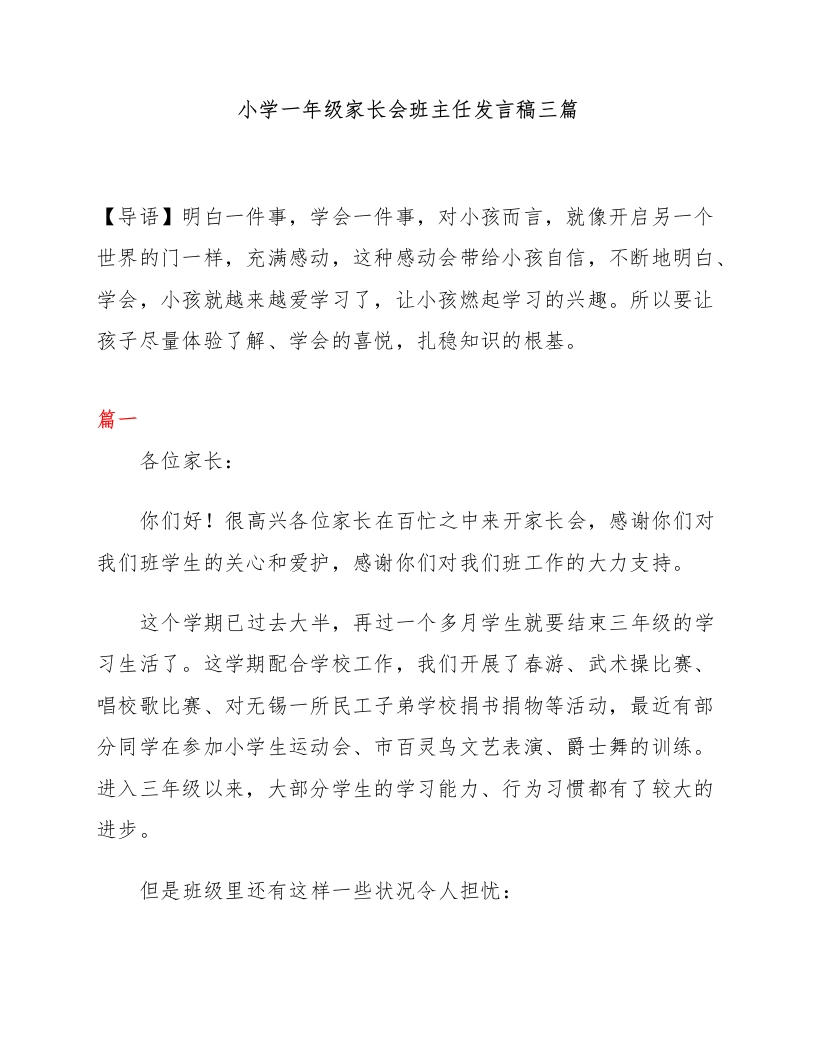 首页班主任资料家长家委小学一年级家长会班主任发言稿三篇