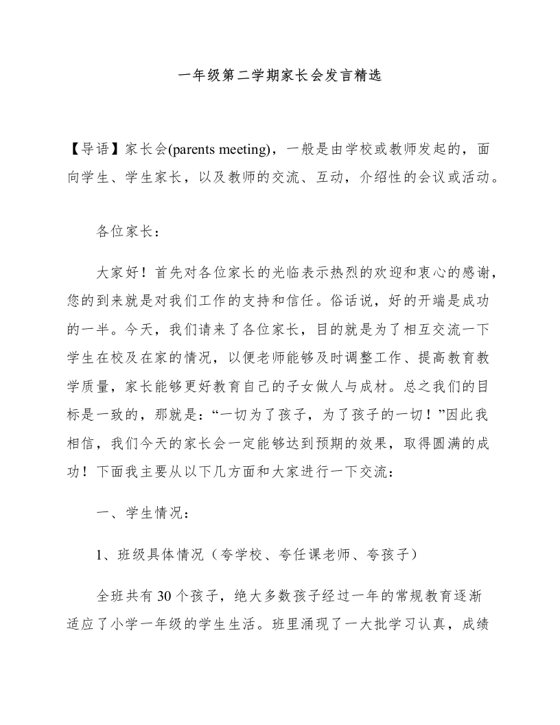 一年级第二学期家长会发言精选
