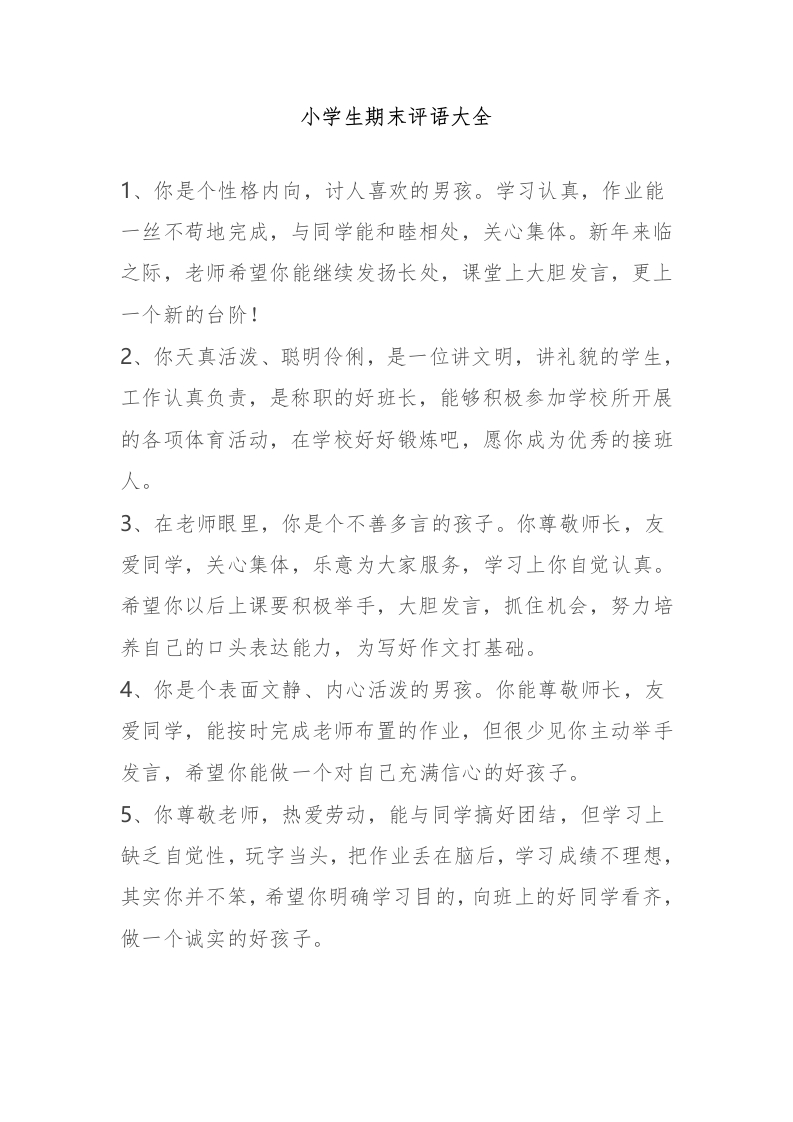 期末班主任评语大全