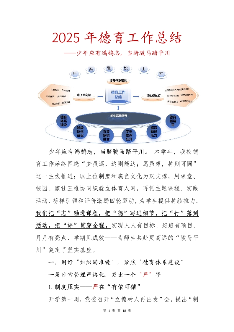 2025年德育工作总结一少年应有鸿鹄志,当骑骏马踏平川德育工作班子风向际总结活动丝钉学生系养跃升体系建班级队伍学生家校少年应有鸿鹄志,当骑骏马踏平川。本学年,我校德育工作始终围绕“梦虽遥,追则能达;愿虽艰,持则可圆”这一主线推进:以上位制度和底色文化为双支撑,用课堂、校园、家社三维协同织就立体育人网,再凭主题课程、实践活动、榜样引领和评价激励四轮驱动,为学生提供持续推力。我们把“志”融进课程,把“德”写进细节,把“行”落到活动,把“评”贯穿全程,实现人人有目标、班班有项目、月月有亮点、学期见成效一一为师生共赴更高远的“骏马平川”奠定了坚实基座。一、用好“组织瞄准镜”,聚焦“德育体系建设”一是日常管理严格化,突出一个“严”字1.制度压实一一严在“有依可循”开学第一周,党委召开“立德树人再出发”会,提出“制第1页共18页