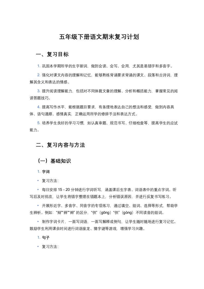 五年级下册语文期末复习计划一、复习目标1.巩固本学期所学的生字新词,做到会读、会写、会用,尤其是易错字和多音字。2.强化对课文内容的理解和记忆,能够熟练背诵要求背诵的课文、段落和古诗词,理解其含义和表达的情感。3.提升阅读理解能力,包括对不同体裁文章的理解、分析和概括能力,掌握常见的阅读答题技巧。4.提高写作水平,能根据题目要求,有条理地表达自己的想法和感受,做到内容具体、语句通顺、感情真实,正确运用所学的修辞手法和表达方式。5.培养学生良好的学习习惯,如认真审题、规范书写、仔细检查等,提高学生的应试能力。二、复习内容与方法(一)基础知识1.字词·复习方法:·每日安排15-20分钟进行字词听写,涵盖课后生字表、词语表中的重点字词。听写后及时批改,让学生将错字整理在错题本上,分析错误原因,并进行反复书写练习。·开展形近字、多音字、同音字的专项练习,通过填空、组词、选择等形式,帮助学·制作字词卡片,一面写词语,一面写解释或例句,让学生随时随地进行复习记忆。鼓励学生利用课余时间进行词语接龙、猜字谜等游戏,增强学习兴趣。1.句子·复习方法