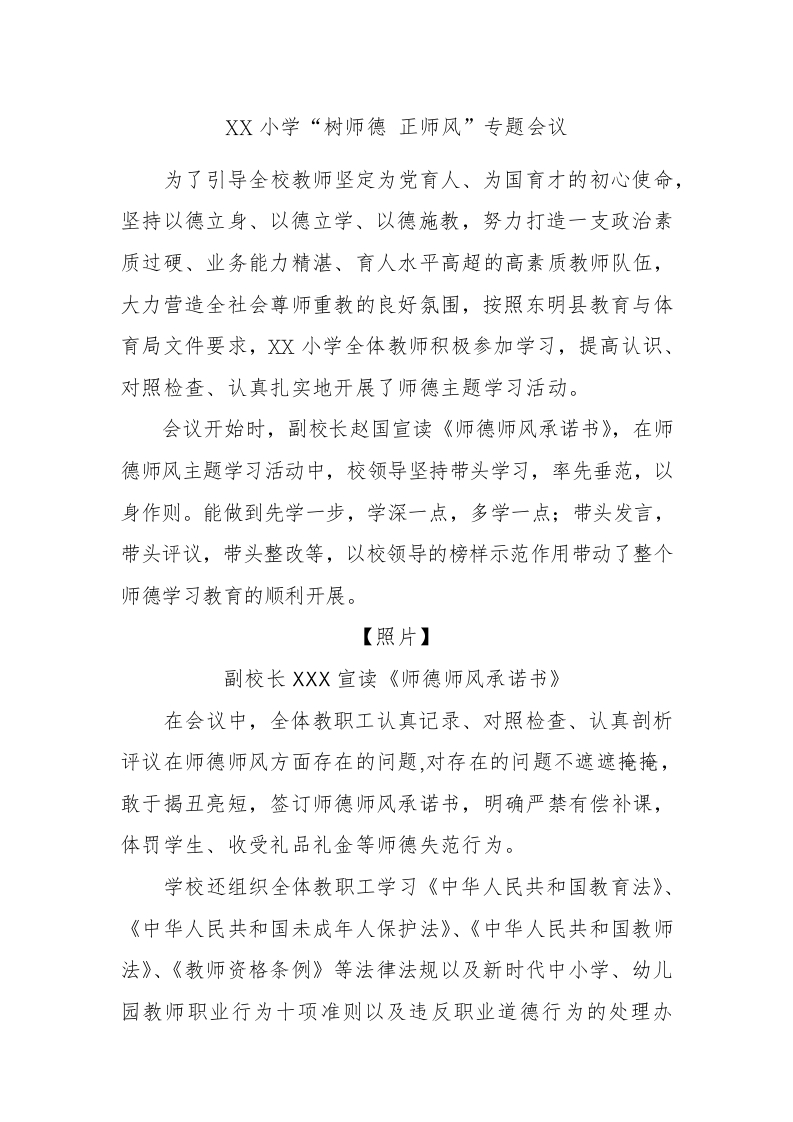 XX小学“树师德正师风”专题会议为了引导全校教师坚定为党育人、为国育才的初心使命,坚持以德立身、以德立学、以德施教,努力打造一支政治素质过硬、业务能力精湛、育人水平高超的高素质教师队伍,大力营造全社会尊师重教的良好氛围,按照东明县教育与体育局文件要求,X小学全体教师积极参加学习,提高认识、对照检查、认真扎实地开展了师德主题学习活动。会议开始时,副校长赵国宣读《师德师风承诺书》,在师德师风主题学习活动中,校领导坚持带头学习,率先垂范,以身作则。能做到先学一步,学深一点,多学一点;带头发言,带头评议,带头整改等,以校领导的榜样示范作用带动了整个师德学习教育的顺利开展。【照片】副校长XXX宣读《师德师风承诺书》在会议中,全体教职工认真记录、对照检查、认真剖析评议在师德师风方面存在的问题,对存在的问题不遮遮掩掩,敢于揭丑亮短,签订师德师风承诺书,明确严禁有偿补课,体罚学生、收受礼品礼金等师德失范行为。学校还组织全体教职工学习《中华人民共和国教育法》、《中华人民共和国未成年人保护法》、《中华人民共和国教师法》、《教师资格条例》等法律法规以及新时代中小学、幼儿园教师职业行为十项准则以及违反职业道德行为的处理办