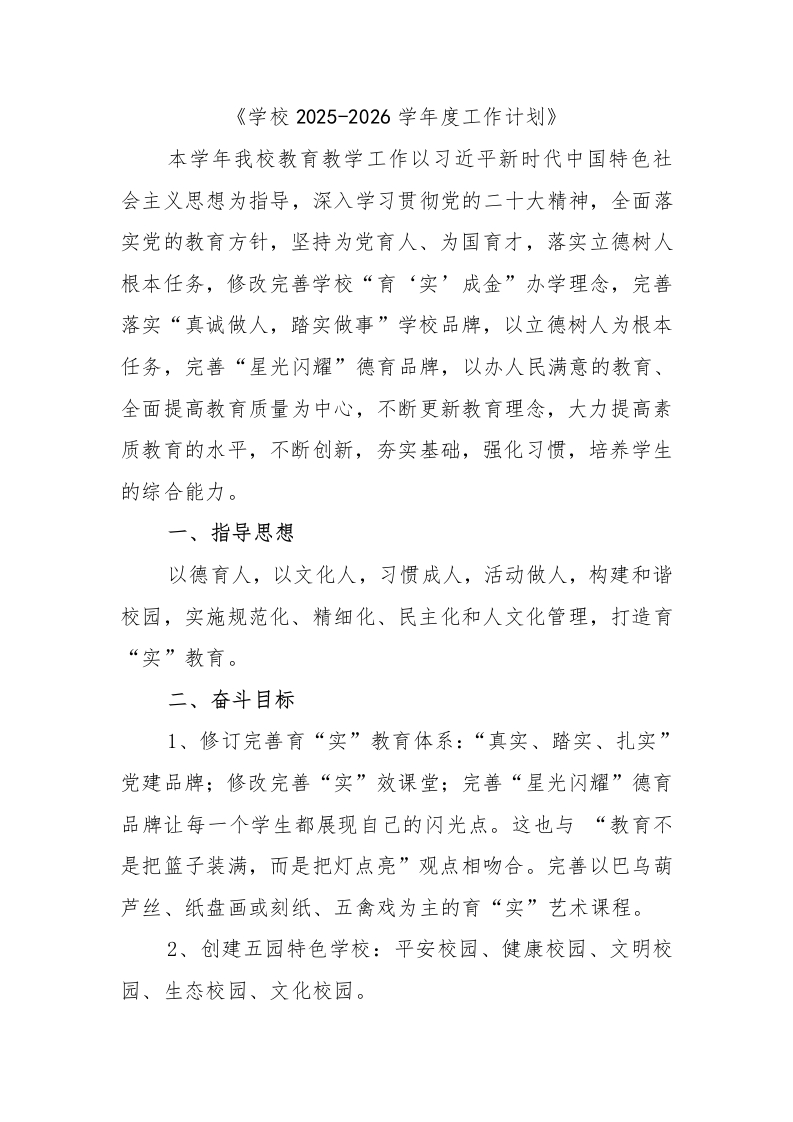 《学校2025-2026学年度工作计划》本学年我校教育教学工作以习近平新时代中国特色社会主义思想为指导,深入学习贯彻党的二十大精神,全面落实党的教育方针,坚持为党育人、为国育才,落实立德树人根本任务,修改完善学校“育‘实’成金”办学理念,完善落实“真诚做人,踏实做事”学校品牌,以立德树人为根本任务,完善“星光闪耀”德育品牌,以办人民满意的教育、全面提高教育质量为中心,不断更新教育理念,大力提高素质教育的水平,不断创新,夯实基础,强化习惯,培养学生的综合能力。一、指导思想以德育人,以文化人,习惯成人,活动做人,构建和谐校园,实施规范化、精细化、民主化和人文化管理,打造育“实”教育。二、奋斗目标1、修订完善育“实”教育体系:“真实、踏实、扎实”党建品牌;修改完善“实”效课堂;完善“星光闪耀”德育品牌让每一个学生都展现自己的闪光点。这也与“教育不是把篮子装满,而是把灯点亮”观点相吻合。完善以巴鸟葫芦丝、纸盘画或刻纸、五禽戏为主的育“实”艺术课程。2、创建五园特色学校:平安校园、健康校园、文明校园、生态校园、文化校园。
