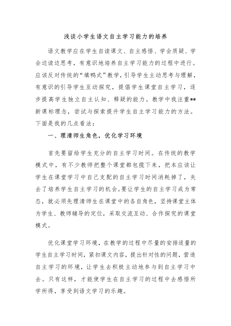 浅谈小学生语文自主学习能力的培养语文教学应在学生自读课文、自主感悟、学会质疑、学会边读边思考,有意识地培养自主学习能力的过程中进行。应该反对传统的“填鸭式”教学,引导学生主动思考与理解,有意识的引导学生互动探究,提倡学生课堂自主学习,逐步提高学生独立自主认知、释疑的能力。教学中我注重*新课标理念,尝试与探索提升学生自主学习能力的方法。下面是我的几点看法:一、理清师生角色,优化学习环境首先要留给学生充分的自主学习时间。在传统的教学模式中,有不少教师把整个课堂都包揽下来,把本应该让学生在课堂学习中自己支配的自主学习时间消耗掉了,失去了培养学生自主学习的机会。要让学生的自主学习成为常态,就必须先理清师生在课堂中的各自角色,坚持课堂主体为学生、教师辅导的定位,采取交流互动、合作探究的课堂模式。优化课堂学习环境,在教学的过程中尽量的安排适量的学生自主学习时间,紧扣课文内容,提出针对性的问题,营造自主学习的环境,让学生去积极主动地参与到自主学习中去。只有这样,才能使学生在自主学习的过程中去感悟所学所得,享受到语文学习的乐趣。