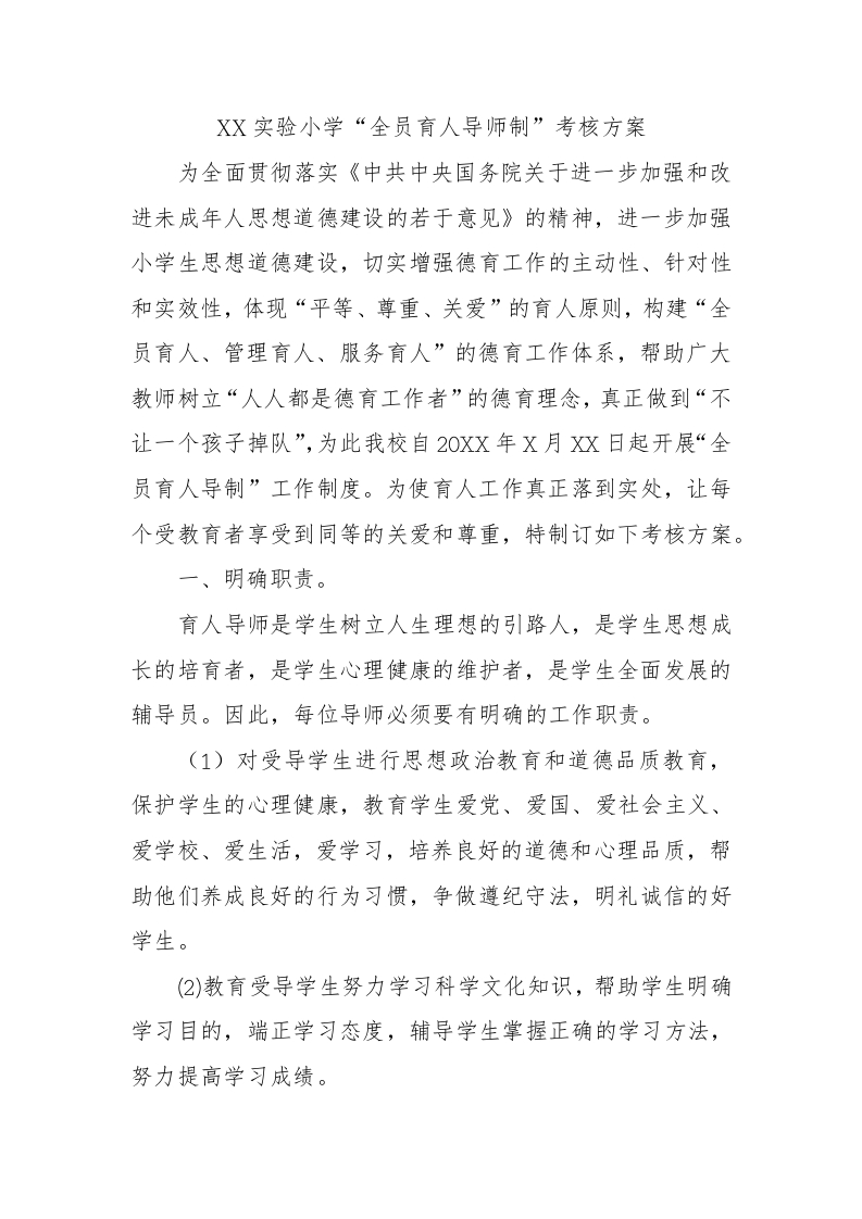 XX实验小学“全员育人导师制”考核方案为全面贯彻落实《中共中央国务院关于进一步加强和改进未成年人思想道德建设的若于意见》的精神,进一步加强小学生思想道德建设,切实增强德育工作的主动性、针对性和实效性,体现“平等、尊重、关爱”的育人原则,构建“全员育人、管理育人、服务育人”的德育工作体系,帮助广大教师树立“人人都是德育工作者”的德育理念,真正做到“不让一个孩子掉队”,为此我校自20XX年X月X日起开展“全员育人导制”工作制度。为使育人工作真正落到实处,让每个受教育者享受到同等的关爱和尊重,特制订如下考核方案。一、明确职责。育人导师是学生树立人生理想的引路人,是学生思想成长的培育者,是学生心理健康的维护者,是学生全面发展的辅导员。因此,每位导师必须要有明确的工作职责。(1)对受导学生进行思想政治教育和道德品质教育,保护学生的心理健康,教育学生爱党、爱国、爱社会主义、爱学校、爱生活,爱学习,培养良好的道德和心理品质,帮助他们养成良好的行为习惯,争做遵纪守法,明礼诚信的好学生。(2)教育受导学生努力学习科学文化知识,帮助学生明确学习目的,端正学习态度,辅导学生掌握正确的学习方法,努力提高学习成绩。