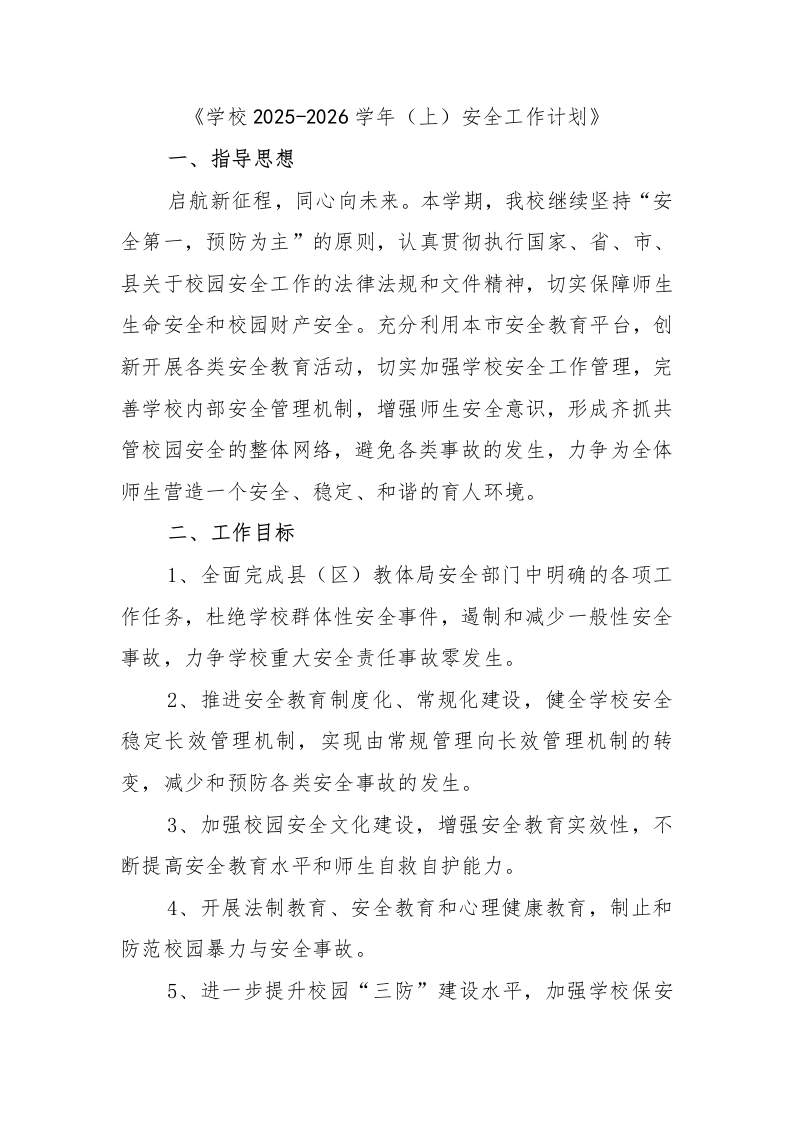 《学校2025-2026学年(上)安全工作计划》一、指导思想启航新征程,同心向未来。本学期,我校继续坚持“安全第一,预防为主”的原则,认真贯彻执行国家、省、市、县关于校园安全工作的法律法规和文件精神,切实保障师生生命安全和校园财产安全。充分利用本市安全教育平台,创新开展各类安全教育活动,切实加强学校安全工作管理,完善学校内部安全管理机制,增强师生安全意识,形成齐抓共管校园安全的整体网络,避免各类事故的发生,力争为全体师生营造一个安全、稳定、和谐的育人环境。二、工作目标1、全面完成县(区)教体局安全部门中明确的各项工作任务,杜绝学校群体性安全事件,遏制和减少一般性安全事故,力争学校重大安全责任事故零发生。2、推进安全教育制度化、常规化建设,健全学校安全稳定长效管理机制,实现由常规管理向长效管理机制的转变,减少和预防各类安全事故的发生。3、加强校园安全文化建设,增强安全教育实效性,不断提高安全教育水平和师生自救自护能力。4、开展法制教育、安全教育和心理健康教育,制止和防范校园暴力与安全事故。5、进一步提升校园“三防”建设水平,加强学校保安