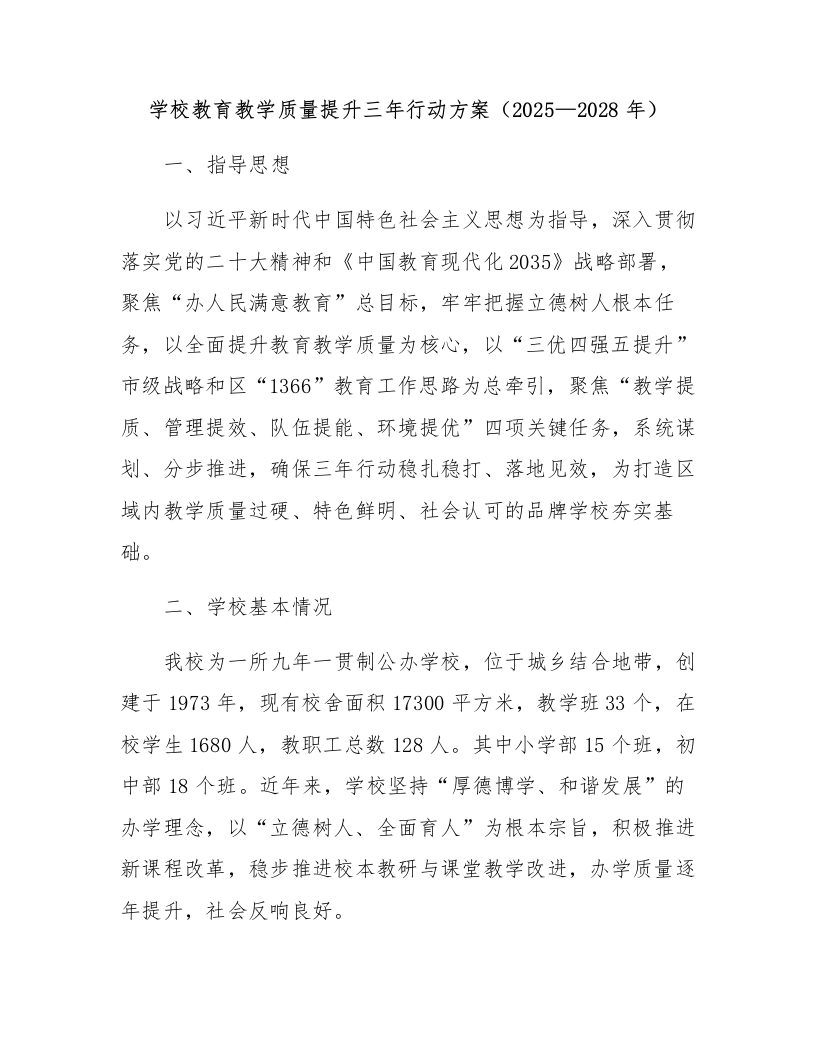 学校教育教学质量提升三年行动方案(2025一2028年)一、指导思想以习近平新时代中国特色社会主义思想为指导,深入贯彻落实党的二十大精神和《中国教育现代化2035》战略部署,聚焦“办人民满意教育”总目标,牢牢把握立德树人根本任务,以全面提升教育教学质量为核心,以“三优四强五提升”市级战略和区“1366”教育工作思路为总牵引,聚焦“教学提质、管理提效、队伍提能、环境提优”四项关键任务,系统谋划、分步推进,确保三年行动稳扎稳打、落地见效,为打造区域内教学质量过硬、特色鲜明、社会认可的品牌学校夯实基础。二、学校基本情况我校为一所九年一贯制公办学校,位于城乡结合地带,创建于1973年,现有校舍面积17300平方米,教学班33个,在校学生1680人,教职工总数128人。其中小学部15个班,初中部18个班。近年来,学校坚持“厚德博学、和谐发展”的办学理念,以“立德树人、全面育人”为根本宗旨,积极推进新课程改革,稳步推进校本教研与课堂教学改进,办学质量逐年提升,社会反响良好。