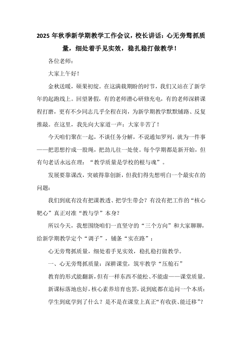 2025年秋季新学期教学工作会议,校长讲话:心无旁骛抓质量,细处着手见实效,稳扎稳打做教学!各位老师:大家上午好!金秋送暖,硕果初绽。在这满载期盼的时节,我们又站在了新学年的起跑线上。回望暑假,有的老师潜心研修充电,有的老师深耕课程打磨,更有不少同志几乎全程在岗,为新学期教学默默铺路、反复推敲。在这里,我先向大家道一声:大家辛苦了!今天咱们聚在一起,不谈任务分解,不说通知罗列,就为一件事一一把思想拧成一股绳,把劲儿往一处使。每个学期都是新开始,但有句老话永远在理:“教学质量是学校的根与魂”。发展要靠课改,突破得靠创新,但我们得先想明白一个最实在的问题:我们到底有没有把课教透、把学生带会?有没有把工作的“核心靶心”真正对准“教与学”本身?所以今天,我想围绕咱们一直坚守的“三个方向”和大家聊聊,给新学期教学定个“调子”,铺条“实在路”:心无旁骛抓质量,细处着手见实效,稳扎稳打做教学。一、心无旁骛抓质量:深耕课堂,筑牢教学“压舱石”教育的形式能翻新,但有一样东西不能松、不能虚一一课堂质量。新课标落地也好,核心素养培育也罢,说到底都在追问一个本质:学生到底学到了什么?是不是在课堂上真正“有收获、能迁移”?