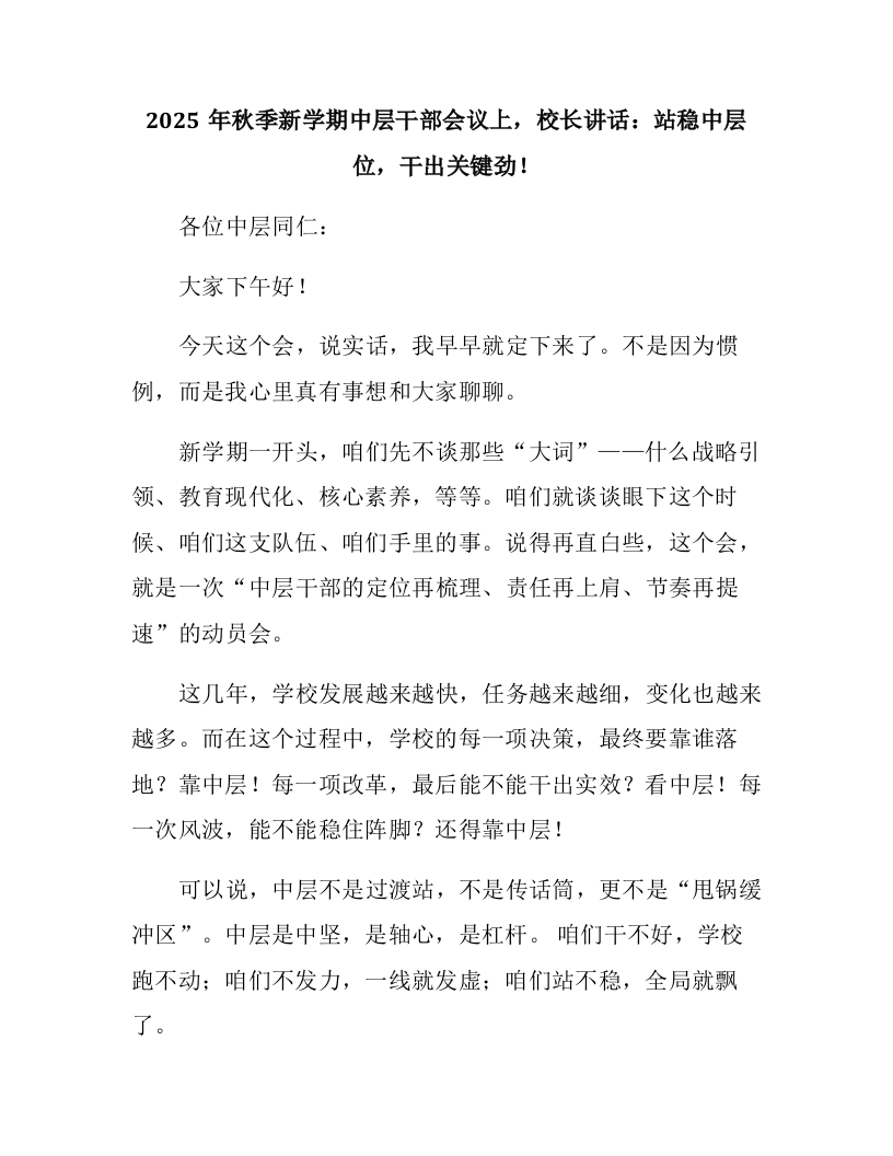 2025年秋季新学期中层干部会议上,校长讲话:站稳中层位,干出关键劲!各位中层同仁:大家下午好!今天这个会,说实话,我早早就定下来了。不是因为惯例,而是我心里真有事想和大家聊聊。新学期一开头,咱们先不谈那些“大词”一一什么战略引领、教育现代化、核心素养,等等。咱们就谈谈眼下这个时候、咱们这支队伍、咱们手里的事。说得再直白些,这个会,就是一次“中层干部的定位再梳理、责任再上肩、节奏再提速”的动员会。这几年,学校发展越来越快,任务越来越细,变化也越来越多。而在这个过程中,学校的每一项决策,最终要靠谁落地?靠中层!每一项改革,最后能不能干出实效?看中层!每一次风波,能不能稳住阵脚?还得靠中层!可以说,中层不是过渡站,不是传话筒,更不是“甩锅缓冲区”。中层是中坚,是轴心,是杠杆。咱们干不好,学校跑不动:咱们不发力,一线就发虚;咱们站不稳,全局就飘了。
