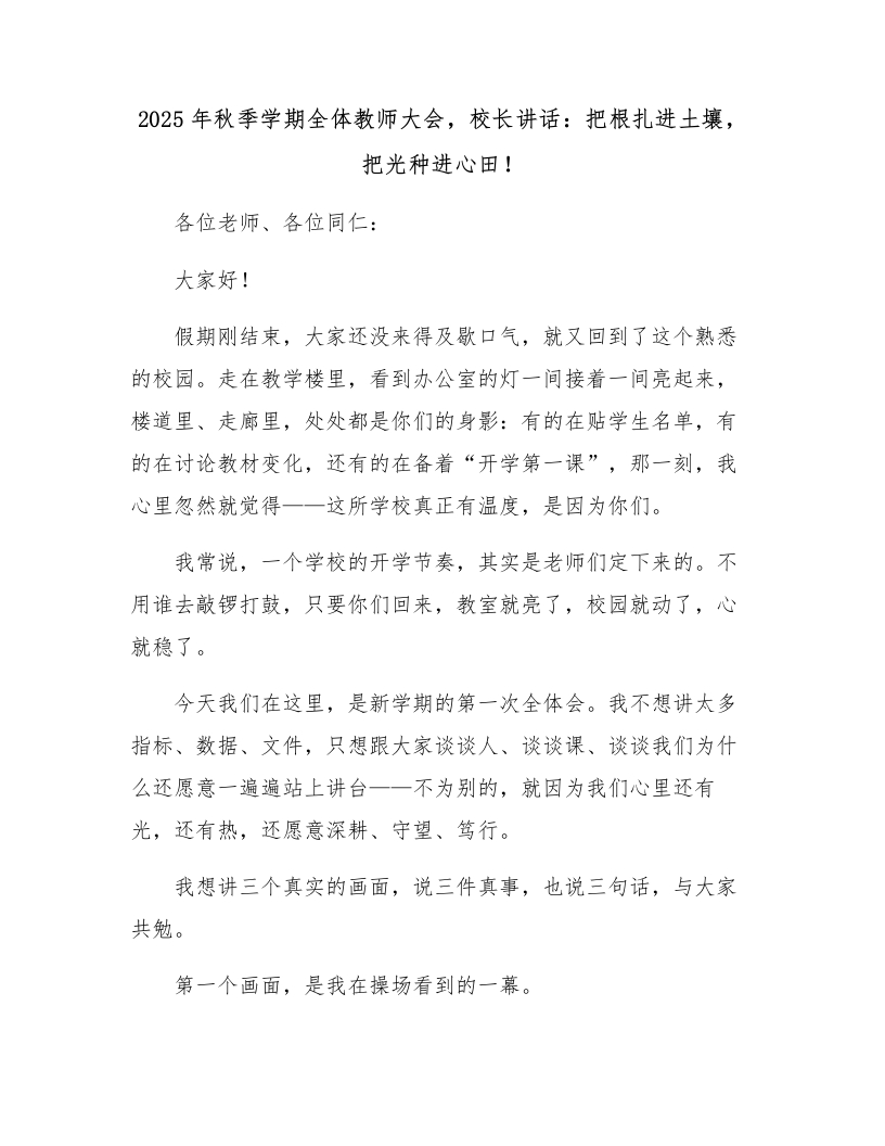 2025年秋季学期全体教师大会,校长讲话:把根扎进土壤,把光种进心田!各位老师、各位同仁:大家好!假期刚结束,大家还没来得及歇口气,就又回到了这个熟悉的校园。走在教学楼里,看到办公室的灯一间接着一间亮起来,楼道里、走廊里,处处都是你们的身影:有的在贴学生名单,有的在讨论教材变化,还有的在备着“开学第一课”,那一刻,我心里忽然就觉得一一这所学校真正有温度,是因为你们。我常说,一个学校的开学节奏,其实是老师们定下来的。不用谁去敲锣打鼓,只要你们回来,教室就亮了,校园就动了,心就稳了。今天我们在这里,是新学期的第一次全体会。我不想讲太多指标、数据、文件,只想跟大家谈谈人、谈谈课、谈谈我们为什么还愿意一遍遍站上讲台一一不为别的,就因为我们心里还有光,还有热,还愿意深耕、守望、笃行。我想讲三个真实的画面,说三件真事,也说三句话,与大家共勉。第一个画面,是我在操场看到的一幕。