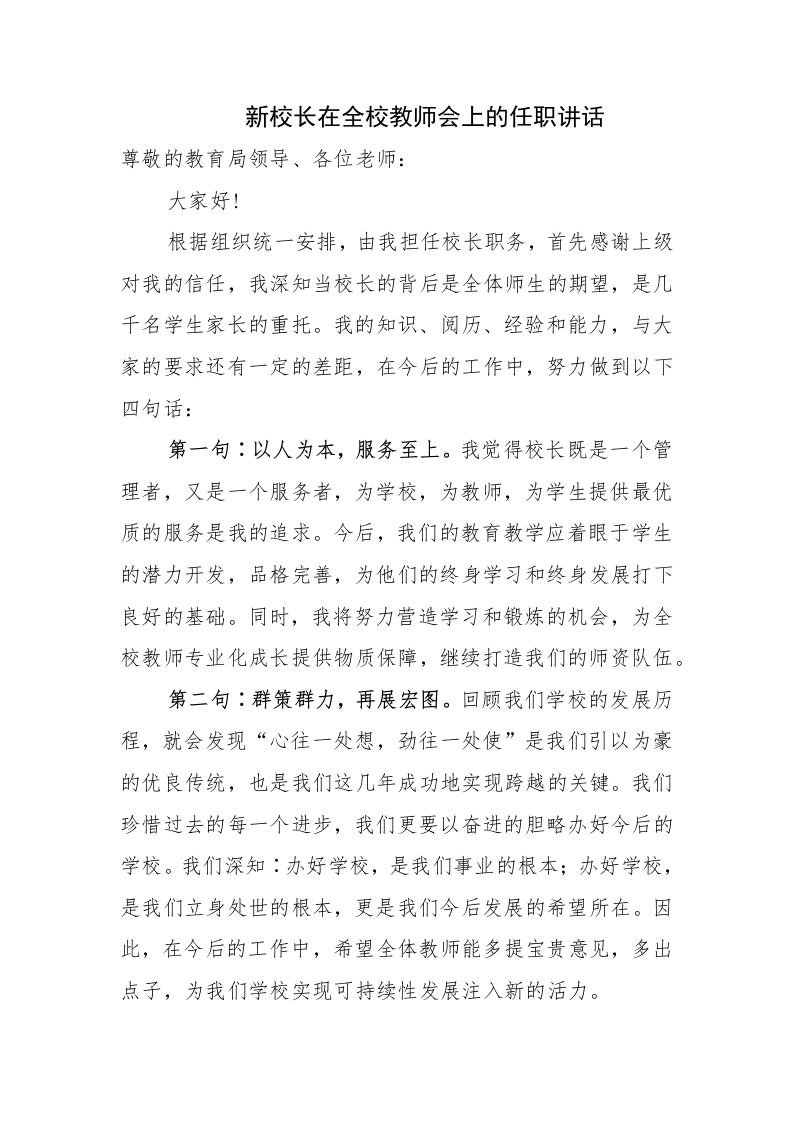 新校长在全校教师会上的任职讲话尊敬的教育局领导、各位老师:大家好!根据组织统一安排,由我担任校长职务,首先感谢上级对我的信任,我深知当校长的背后是全体师生的期望,是几千名学生家长的重托。我的知识、阅历、经验和能力,与大家的要求还有一定的差距,在今后的工作中,努力做到以下四句话:第一句:以人为本,服务至上。我觉得校长既是一个管理者,又是一个服务者,为学校,为教师,为学生提供最优质的服务是我的追求。今后,我们的教育教学应着眼于学生的潜力开发,品格完善,为他们的终身学习和终身发展打下良好的基础。同时,我将努力营造学习和锻炼的机会,为全校教师专业化成长提供物质保障,继续打造我们的师资队伍。第二句:群策群力,再展宏图。回顾我们学校的发展历程,就会发现“心往一处想,劲往一处使”是我们引以为豪的优良传统,也是我们这几年成功地实现跨越的关键。我们珍惜过去的每一个进步,我们更要以奋进的胆略办好今后的学校。我们深知:办好学校,是我们事业的根本;办好学校,是我们立身处世的根本,更是我们今后发展的希望所在。因此,在今后的工作中,希望全体教师能多提宝贵意见,多出点子,为我们学校实现可持续性发展注入新的活力。