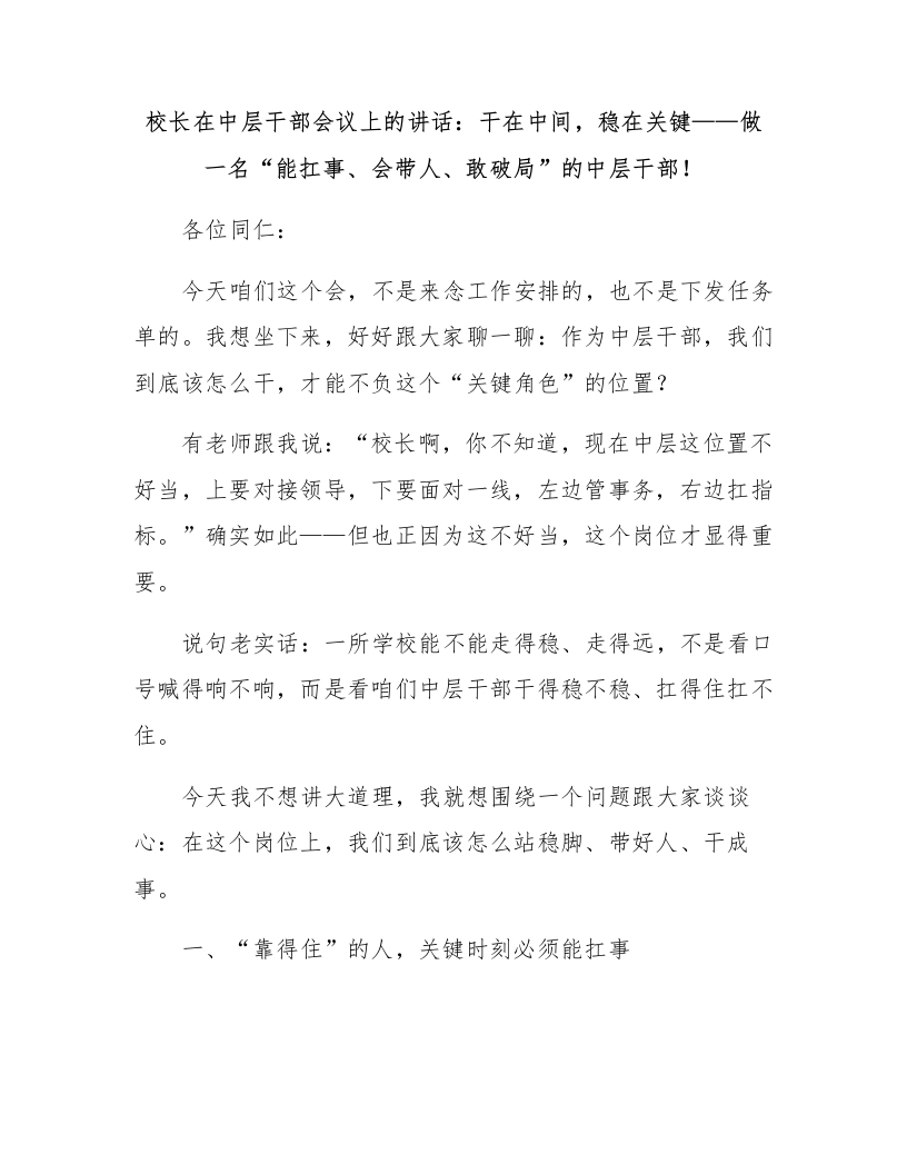 校长在中层干部会议上的讲话:干在中间,稳在关键一一做一名“能扛事、会带人、敢破局”的中层干部!各位同仁:今天咱们这个会,不是来念工作安排的,也不是下发任务单的。我想坐下来,好好跟大家聊一聊:作为中层干部,我们到底该怎么干,才能不负这个“关键角色”的位置?有老师跟我说:“校长啊,你不知道,现在中层这位置不好当,上要对接领导,下要面对一线,左边管事务,右边扛指标。”确实如此一一但也正因为这不好当,这个岗位才显得重要。说句老实话:一所学校能不能走得稳、走得远,不是看口号喊得响不响,而是看咱们中层干部干得稳不稳、扛得住扛不住。今天我不想讲大道理,我就想围绕一个问题跟大家谈谈心:在这个岗位上,我们到底该怎么站稳脚、带好人、干成事。一、“靠得住”的人,关键时刻必须能扛事