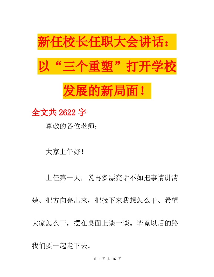新任校长任职大会讲话:以“三个重塑”打开学校发展的新局面!全文共2622字尊敬的各位老师:大家上午好!上任第一天,说再多漂亮话不如把事情讲清楚、把方向亮出来,把接下来我想怎么干、希望大家怎么干,摆在桌面上谈一谈。毕竟以后的路我们要一起走下去。第1页共16页