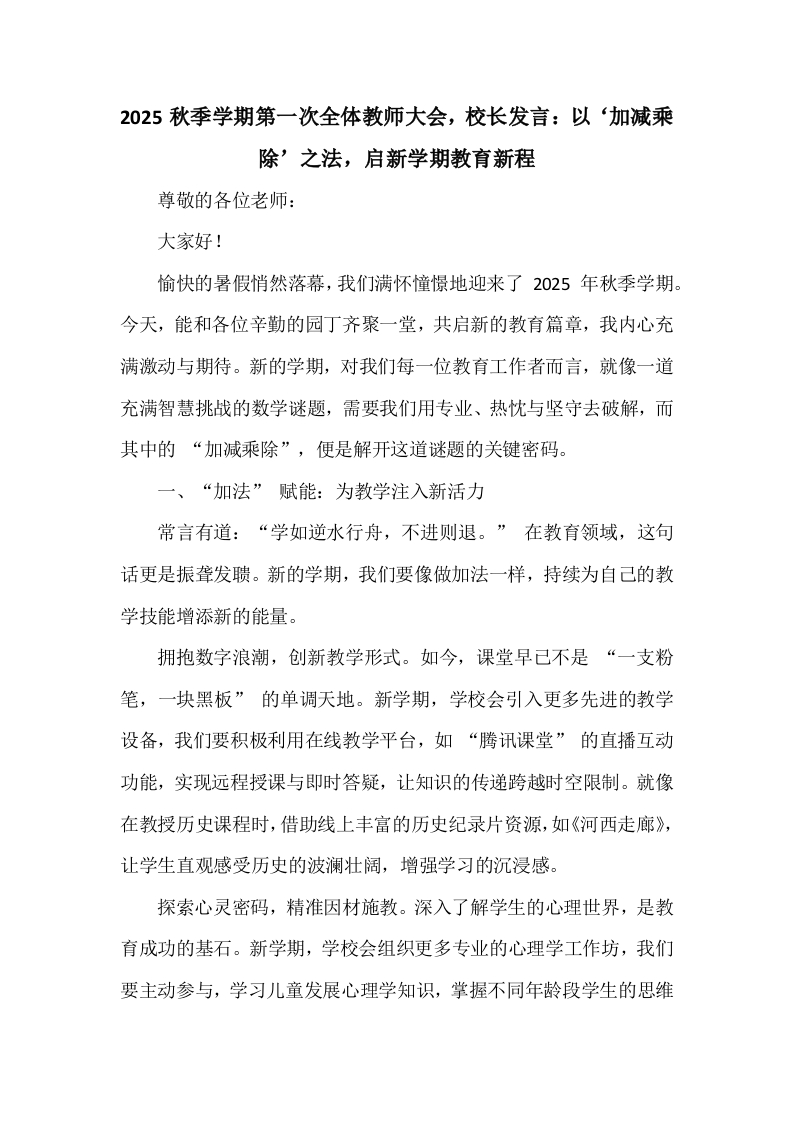 2025秋季学期第一次全体教师大会,校长发言:以‘加减乘除’之法,启新学期教育新程尊敬的各位老师:大家好!愉快的暑假悄然落幕,我们满怀憧憬地迎来了2025年秋季学期。今天,能和各位辛勤的园丁齐聚一堂,共启新的教育篇章,我内心充满激动与期待。新的学期,对我们每一位教育工作者而言,就像一道充满智慧挑战的数学谜题,需要我们用专业、热忱与坚守去破解,而其中的“加减乘除”,便是解开这道谜题的关键密码。一、“加法”赋能:为教学注入新活力常言有道:“学如逆水行舟,不进则退。”在教育领域,这句话更是振聋发聩。新的学期,我们要像做加法一样,持续为自己的教学技能增添新的能量。拥抱数字浪潮,创新教学形式。如今,课堂早已不是“一支粉笔,一块黑板”的单调天地。新学期,学校会引入更多先进的教学设备,我们要积极利用在线教学平台,如“腾讯课堂”的直播互动功能,实现远程授课与即时答疑,让知识的传递跨越时空限制。就像在教授历史课程时,借助线上丰富的历史纪录片资源,如《河西走廊》,让学生直观感受历史的波澜壮阔,增强学习的沉浸感。探索心灵密码,精准因材施教。深入了解学生的心理世界,是教育成功的基石。新学期,学校会组织更多专业的心理学工作坊,我们要主动参与,学习儿童发展心理学知识,掌握不同年龄段学生的思维