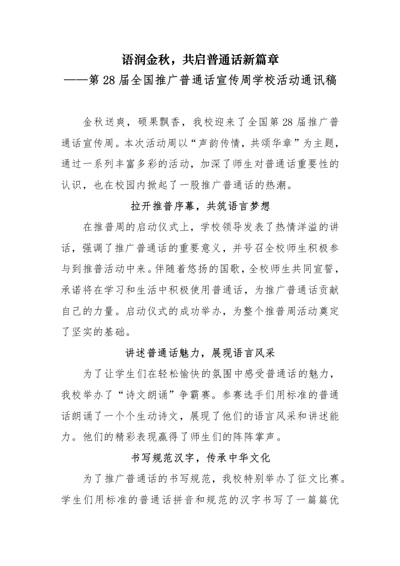 语润金秋,共启普通话新篇章第28届全国推广普通话宣传周学校活动通讯稿金秋送爽,硕果飘香,我校迎来了全国第28届推广普通话宣传周。本次活动周以“声韵传情,共颂华章”为主题,通过一系列丰富多彩的活动,加深了师生对普通话重要性的认识,也在校园内掀起了一股推广普通话的热潮。拉开推普序幕,共筑语言梦想在推普周的启动仪式上,学校领导发表了热情洋溢的讲话,强调了推广普通话的重要意义,并号召全校师生积极参与到推普活动中来。伴随着悠扬的国歌,全校师生共同宣誓,承诺将在学习和生活中积极使用普通话,为推广普通话贡献自己的力量。启动仪式的成功举办,为整个推普周活动奠定了坚实的基础。讲述普通话魅力,展现语言风采为了让学生们在轻松愉快的氛围中感受普通话的魅力,我校举办了“诗文朗诵”争霸赛。参赛选手们用标准的普通话朗诵了一个个生动诗文,展现了他们的语言风采和讲述能力。他们的精彩表现赢得了师生们的阵阵掌声。书写规范汉字,传承中华文化为了推广普通话的书写规范,我校特别举办了征文比赛。学生们用标准的普通话拼音和规范的汉字书写了一篇篇优