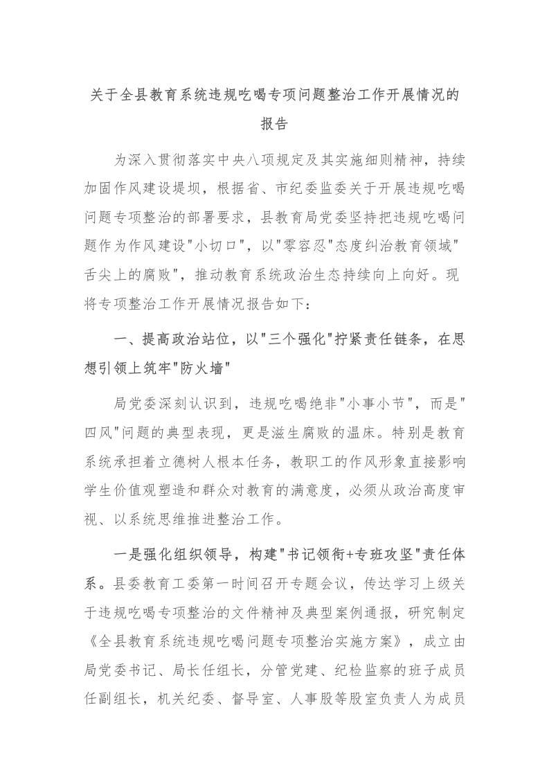关于全县教育系统违规吃喝专项问题整治工作开展情况的报告为深入贯彻落实中央八项规定及其实施细则精神,持续加固作风建设堤坝,根据省、市纪委监委关于开展违规吃喝问题专项整治的部署要求,县教育局党委坚持把违规吃喝问题作为作风建设”小切口”,以"零容忍"态度纠治教育领域”舌尖上的腐败”,推动教育系统政治生态持续向上向好。现将专项整治工作开展情况报告如下:一、提高政治站位,以"三个强化"拧紧责任链条,在思想引领上筑牢"防火墙"局党委深刻认识到,违规吃喝绝非”小事小节”,而是”四风"问题的典型表现,更是滋生腐败的温床。特别是教育系统承担着立德树人根本任务,教职工的作风形象直接影响学生价值观塑造和群众对教育的满意度,必须从政治高度审视、以系统思维推进整治工作。一是强化组织领导,构建"书记领衔+专班攻坚"责任体系。县委教育工委第一时间召开专题会议,传达学习上级关于违规吃喝专项整治的文件精神及典型案例通报,研究制定《全县教育系统违规吃喝问题专项整治实施方案》,成立由局党委书记、局长任组长,分管党建、纪检监察的班子成员任副组长,机关纪委、督导室、人事股等股室负责人为成员