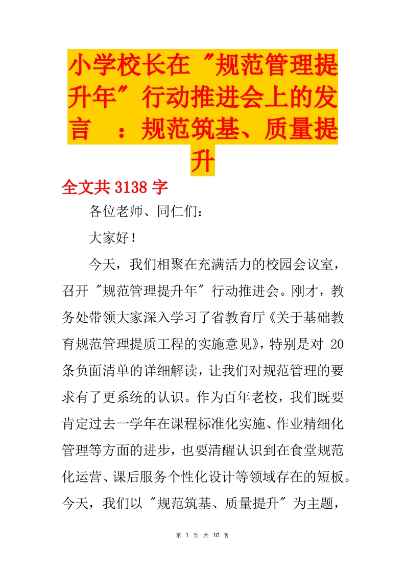小学校长在"规范管理提升年”行动推进会上的发言:规范筑基、质量提全文共3138字各位老师、同仁们:大家好!今天,我们相聚在充满活力的校园会议室,召开"规范管理提升年”行动推进会。刚才,教务处带领大家深入学习了省教育厅《关于基础教育规范管理提质工程的实施意见》,特别是对20条负面清单的详细解读,让我们对规范管理的要求有了更系统的认识。作为百年老校,我们既要肯定过去一学年在课程标准化实施、作业精细化管理等方面的进步,也要清醒认识到在食堂规范化运营、课后服务个性化设计等领域存在的短板。今天,我们以"规范筑基、质量提升”为主题,第1页共10页
