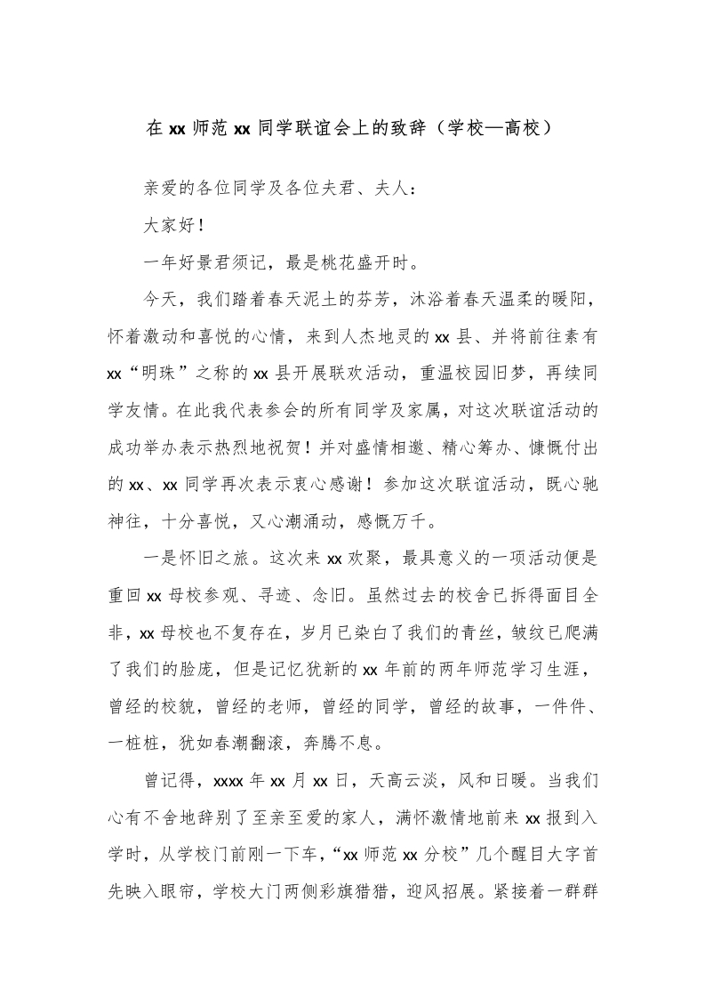 在x师范x同学联谊会上的致辞(学校一高校)亲爱的各位同学及各位夫君、夫人:大家好!一年好景君须记,最是桃花盛开时。今天,我们踏着春天泥土的芬芳,沐浴着春天温柔的暖阳,怀着激动和喜悦的心情,来到人杰地灵的双县、并将前往素有x“明珠”之称的双县开展联欢活动,重温校园旧梦,再续同学友情。在此我代表参会的所有同学及家属,对这次联谊活动的成功举办表示热烈地祝贺!并对盛情相邀、精心筹办、慷慨付出的x、x同学再次表示衷心感谢!参加这次联谊活动,既心驰神往,十分喜悦,又心潮涌动,感慨万千。一是怀旧之旅。这次来xx欢聚,最具意义的一项活动便是重回x母校参观、寻迹、念旧。虽然过去的校舍已拆得面目全非,x母校也不复存在,岁月已染白了我们的青丝,皱纹已爬满了我们的脸庞,但是记忆犹新的x年前的两年师范学习生涯,曾经的校貌,曾经的老师,曾经的同学,曾经的故事,一件件、一桩桩,犹如春潮翻滚,奔腾不息。曾记得,xxx年x月x日,天高云淡,风和日暖。当我们心有不舍地辞别了至亲至爱的家人,满怀激情地前来x报到入学时,从学校门前刚一下车,“x师范x分校”几个醒目大字首先映入眼帘,学校大门两侧彩旗猎猎,迎风招展。紧接着一群群