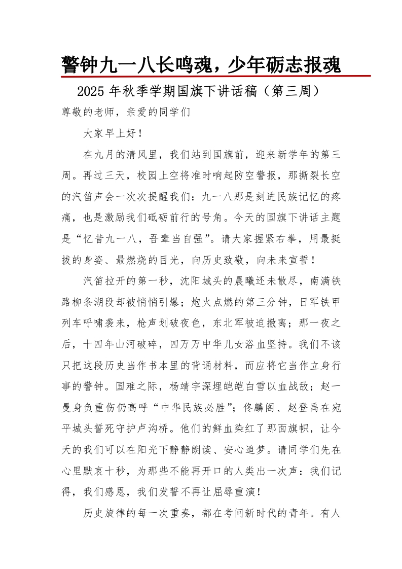警钟九一八长鸣魂,少年砺志报魂2025年秋季学期国旗下讲话稿(第三周)尊敬的老师,亲爱的同学们大家早上好!在九月的清风里,我们站到国旗前,迎来新学年的第三周。再过三天,校园上空将准时响起防空警报,那撕裂长空的汽笛声会一次次提醒我们:九一八那是刻进民族记忆的疼痛,也是激励我们砥砺前行的号角。今天的国旗下讲话主题是“忆昔九一八,吾辈当自强”。请大家握紧右拳,用最挺拔的身姿、最燃烧的目光,向历史致敬,向未来宣誓!汽笛拉开的第一秒,沈阳城头的晨曦还未散尽,南满铁路柳条湖段却被悄悄引爆;炮火点燃的第三分钟,日军铁甲列车呼啸袭来,枪声划破夜色,东北军被迫撤离;那一夜之后,十四年山河破碎,四万万中华儿女浴血坚持。我们不该只把这段历史当作书本里的背诵材料,而应将它当作立身行事的警钟。国难之际,杨靖宇深埋皑皑白雪以血战敌;赵一曼身负重伤仍高呼“中华民族必胜”;佟麟阁、赵登禹在宛平城头誓死守护卢沟桥。他们的鲜血染红了那面旗帜,让今天的我们可以在阳光下静静朗读、安心追梦。请同学们先在心里默哀十秒,为那些不能再开口的人类出一次声:我们记得,我们感恩,我们发誓不再让屈辱重演!历史旋律的每一次重奏,都在考问新时代的青年。有人