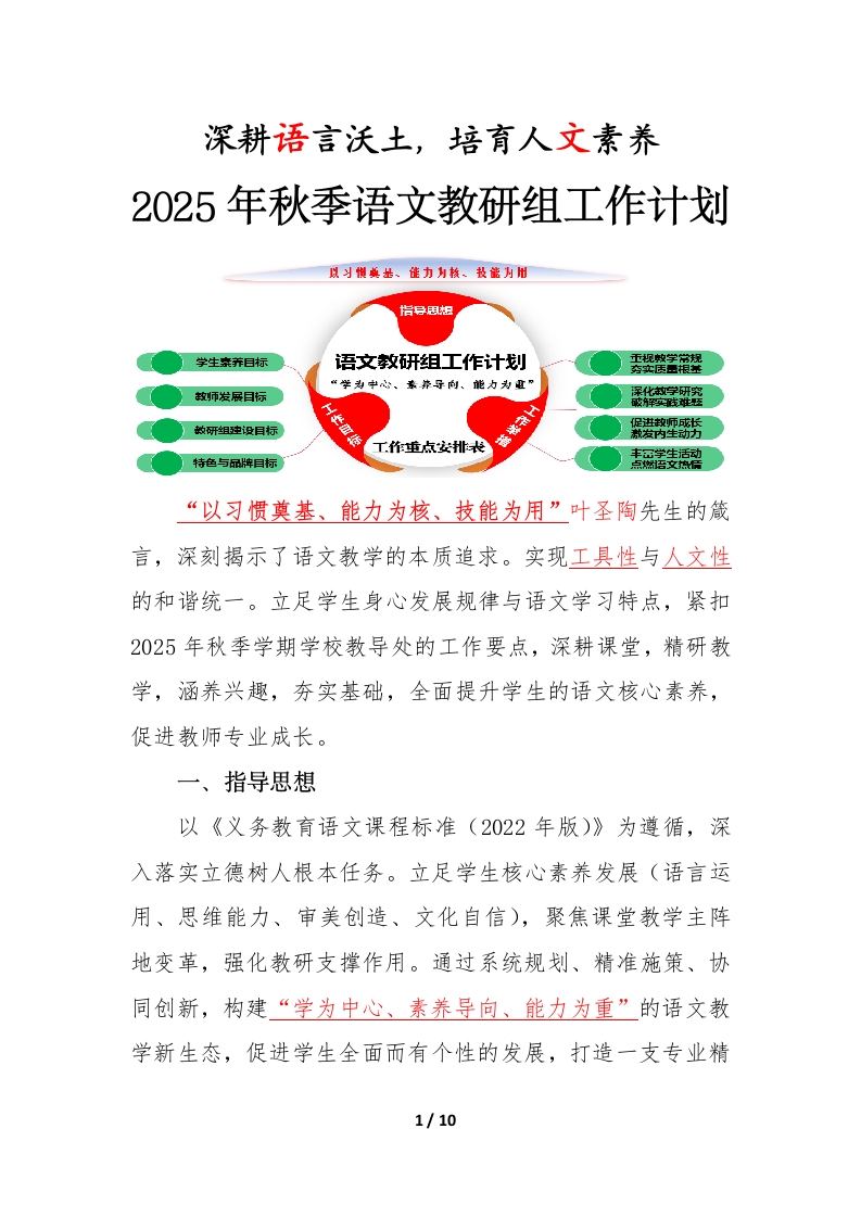 深耕语言沃土,培育人文素养2025年秋季语文教研组工作计划学生杂养目标语文致研组工作计龙划深化学研究发内生动力丰学生活动特色与品牌目标“以习惯奠基、能力为核、技能为用”叶圣陶先生的箴言,深刻揭示了语文教学的本质追求。实现工具性与人文性的和谐统一。立足学生身心发展规律与语文学习特点,紧扣2025年秋季学期学校教导处的工作要点,深耕课堂,精研教学,涵养兴趣,夯实基础,全面提升学生的语文核心素养,促进教师专业成长。一、指导思想以《义务教育语文课程标准(2022年版)》为遵循,深入落实立德树人根本任务。立足学生核心素养发展(语言运用、思维能力、审美创造、文化自信),聚焦课堂教学主阵地变革,强化教研支撑作用。通过系统规划、精准施策、协同创新,构建“学为中心、素养导向、能力为重”的语文教学新生态,促进学生全面而有个性的发展,打造一支专业精1/10