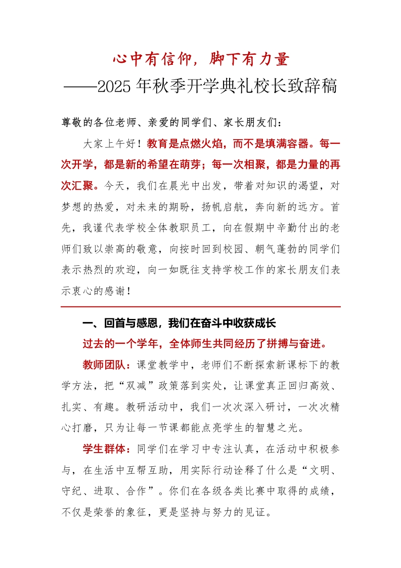 心中有信仰,脚下有力量2025年秋季开学典礼校长致辞稿尊敬的各位老师、亲爱的同学们、家长朋友们:大家上午好!教育是点燃火焰,而不是填满容器。每一次开学,都是新的希望在萌芽;每一次相聚,都是力量的再次汇聚。今天,我们在晨光中出发,带着对知识的渴望,对梦想的热爱,对未来的期盼,扬帆启航,奔向新的远方。首先,我谨代表学校全体教职员工,向在假期中辛勤付出的老师们致以崇高的敬意,向按时回到校园、朝气蓬勃的同学们表示热烈的欢迎,向一如既往支持学校工作的家长朋友们表示衷心的感谢!一、回首与感恩,我们在奋斗中收获成长过去的一个学年,全体师生共同经历了拼搏与奋进。教师团队:课堂教学中,老师们不断探索新课标下的教学方法,把“双减”政策落到实处,让课堂真正回归高效、扎实、有趣。教研活动中,我们一次次深入研讨,一次次精心打磨,只为让每一节课都能点亮学生的智慧之光。学生群体:同学们在学习中专注认真,在活动中积极参与,在生活中互帮互助,用实际行动诠释了什么是“文明、守纪、进取、合作”。你们在各级各类比赛中取得的成绩,不仅是荣誉的象征,更是坚持与努力的见证。