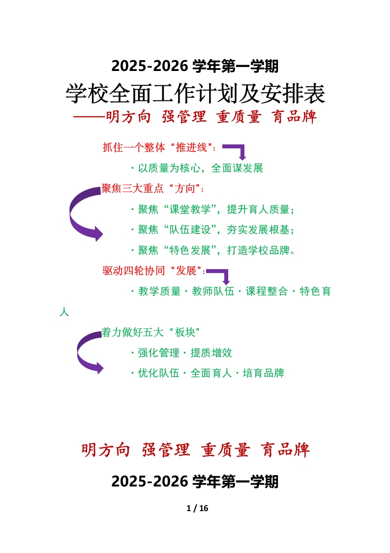 2025-2026学年第一学期学校全面工作计划及安排表明方向强管理重质量育品牌抓住一个整体“推进线”:一·以质量为核心,全面谋发展聚焦三大重点“方向”:·聚焦“课堂教学”,提升育人质量;·聚焦“队伍建设”,夯实发展根基;·聚焦“特色发展”,打造学校品牌。驱动四轮协同“发展”:·教学质量·教师队伍·课程整合·特色育人着力做好五大“板块”·强化管理·提质增效优化队伍・全面育人·培育品牌明方向强管理重质量育品牌2025-2026学年第一学期1/16