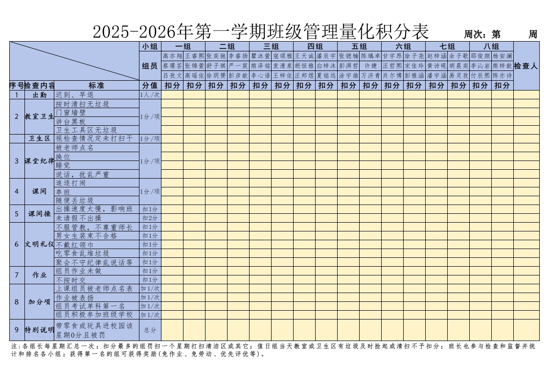2025-2026年第一学期班级管理量化积分表周次:第周小组一组二组三组四组五组六组七组八组高亦翔王睿熙张奕驰李睿扬瞿沐萱寇颂雅王天诚潘辰宇张锶楠陈璃卓甘宇昂徐子尧赵梓涵余子歌邵俊颜杨安澜组员蔡璟芸张锦萱舒子琪严一宸熊泽铭袁清泉胡恒雅白梓沐彭湃哲许婕汪哲熙宋佳玲黄诗砚胡晨奕李沁岩熊梓歆检查人吕孜文高瑶依徐玥赞彭彦歆李心语王梓依汪邦煜夏铭远涂宇雄万济青肖尔博彭雅涵潘宇涵易灵孜付辰熙陈亦诗序号检查内容标准分值扣分扣分扣分扣分扣分扣分扣分扣分扣分扣分扣分扣分扣分扣分扣分扣分1出勤迟到、早退1人/次按时清扫无垃圾1分/项讲台黑板卫生工具区无垃圾卫生区视检查情况定未打扫干1分/项被老师点名睡觉说话,扰乱严重追逐打闹4课间串班1分/项随便丢垃圾5扣1分课间操未请假不出操扣2分不服管教,不尊重师长扣1分男女生装束不合格扣1分6文明礼仪不戴红领巾扣1分吃零食乱堆垃圾扣1分聚会不守纪律乱说话等扣1分7作业组员作业未做扣1分不按时交扣1分上课组员被老师点名表加1/次加1/次加分项作业被表扬组员考试单科第一名加1/次组员积极参加班级学校加1/次9特别说明带零食或玩具进校园该总分星期0分且被罚注:各组长每星期汇总一次:扣分最多的组罚扫一个星期打扫清洁区或其它:值日组当天教室或卫生区有垃圾及时检起或清扫不予扣分;班长也参与检查和监督并统计和排名各小组:获得第一名的组可获得奖励(免作业、免劳动、优先评优等)。