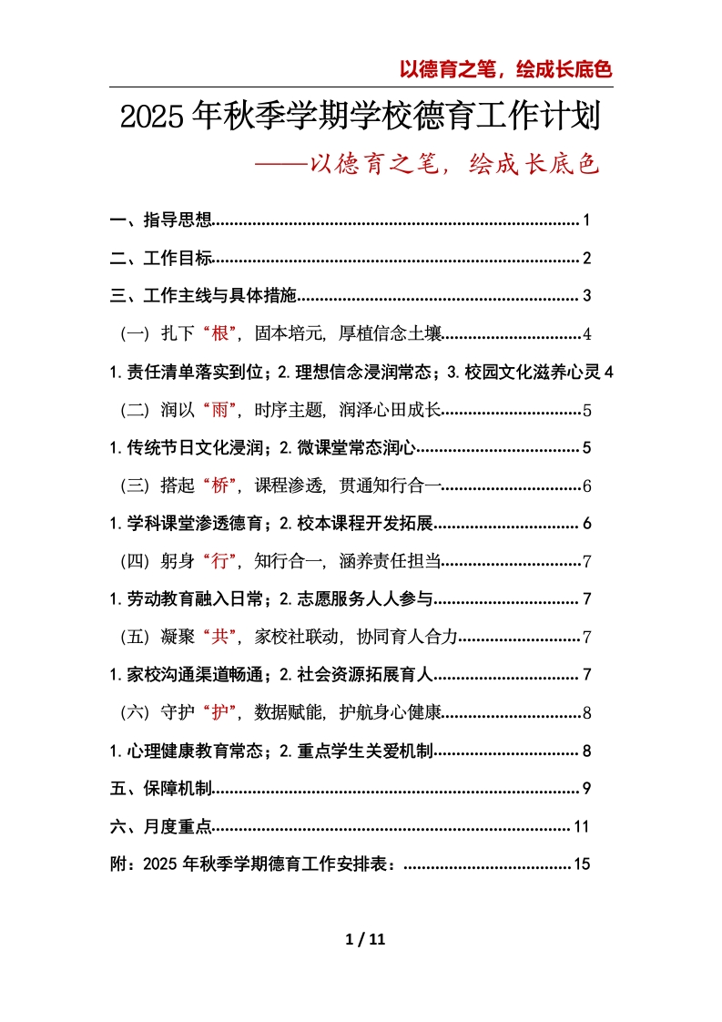 以德育之笔,绘成长底色2025年秋季学期学校德育工作计划以德育之笔,绘成长底色一、指导思想…二、工作目标…三、工作主线与具体措施.3(一)扎下“根”,固本培元,厚植信念土壤…41.责任清单落实到位;2.理想信念浸润常态;3.校园文化滋养心灵4(二)润以“雨”,时序主题,润泽心田成长51.传统节日文化浸润;2.微课堂常态润心…(三)搭起“桥”,课程渗透,贯通知行合1.学科课堂渗透德育;2.校本课程开发拓展…6(四)躬身“行”,知行合一,涵养责任担当…71.劳动教育融入日常;2.志愿服务人人参与…7(五)凝聚“共”,家校社联动,协同育人合力…71.家校沟通渠道畅通;2.社会资源拓展育人…7(六)守护“护”,数据赋能,护航身心健康…81.心理健康教育常态;2.重点学生关爱机制…8五、保障机制…六、月度重点…附:2025年秋季学期德育工作安排表:.151/11