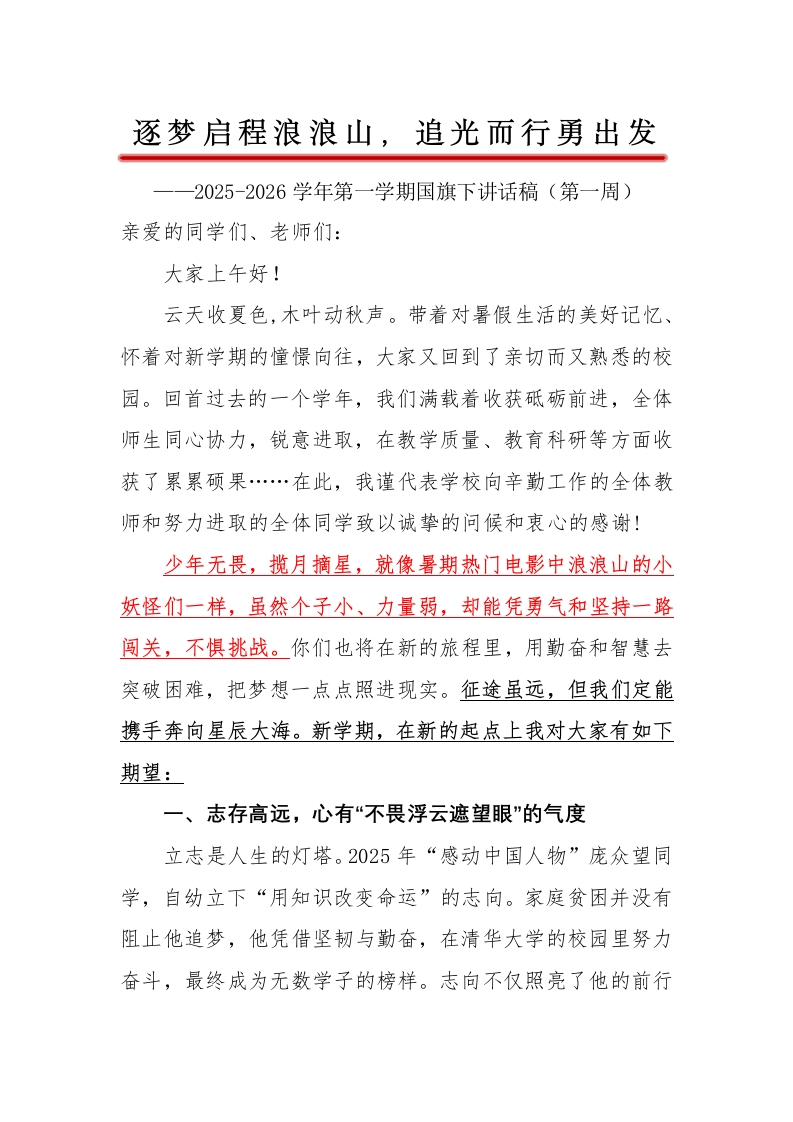 逐梦启程浪浪山,追光而行勇出发2025-2026学年第一学期国旗下讲话稿(第一周)亲爱的同学们、老师们:大家上午好!云天收夏色,木叶动秋声。带着对暑假生活的美好记忆、怀着对新学期的憧憬向往,大家又回到了亲切而又熟悉的校园。回首过去的一个学年,我们满载着收获砥砺前进,全体师生同心协力,锐意进取,在教学质量、教育科研等方面收获了累累硕果…在此,我谨代表学校向辛勤工作的全体教师和努力进取的全体同学致以诚挚的问候和衷心的感谢!少年无畏,揽月摘星,就像暑期热门电影中浪浪山的小妖怪们一样,虽然个子小、力量弱,却能凭勇气和坚持一路闯关,不惧挑战。你们也将在新的旅程里,用勤奋和智慧去突破困难,把梦想一点点照进现实。征途虽远,但我们定能携手奔向星辰大海。新学期,在新的起点上我对大家有如下期望:一、志存高远,心有“不畏浮云遮望眼”的气度立志是人生的灯塔。2025年“感动中国人物”庞众望同学,自幼立下“用知识改变命运”的志向。家庭贫困并没有阻止他追梦,他凭借坚韧与勤奋,在清华大学的校园里努力奋斗,最终成为无数学子的榜样。志向不仅照亮了他的前行