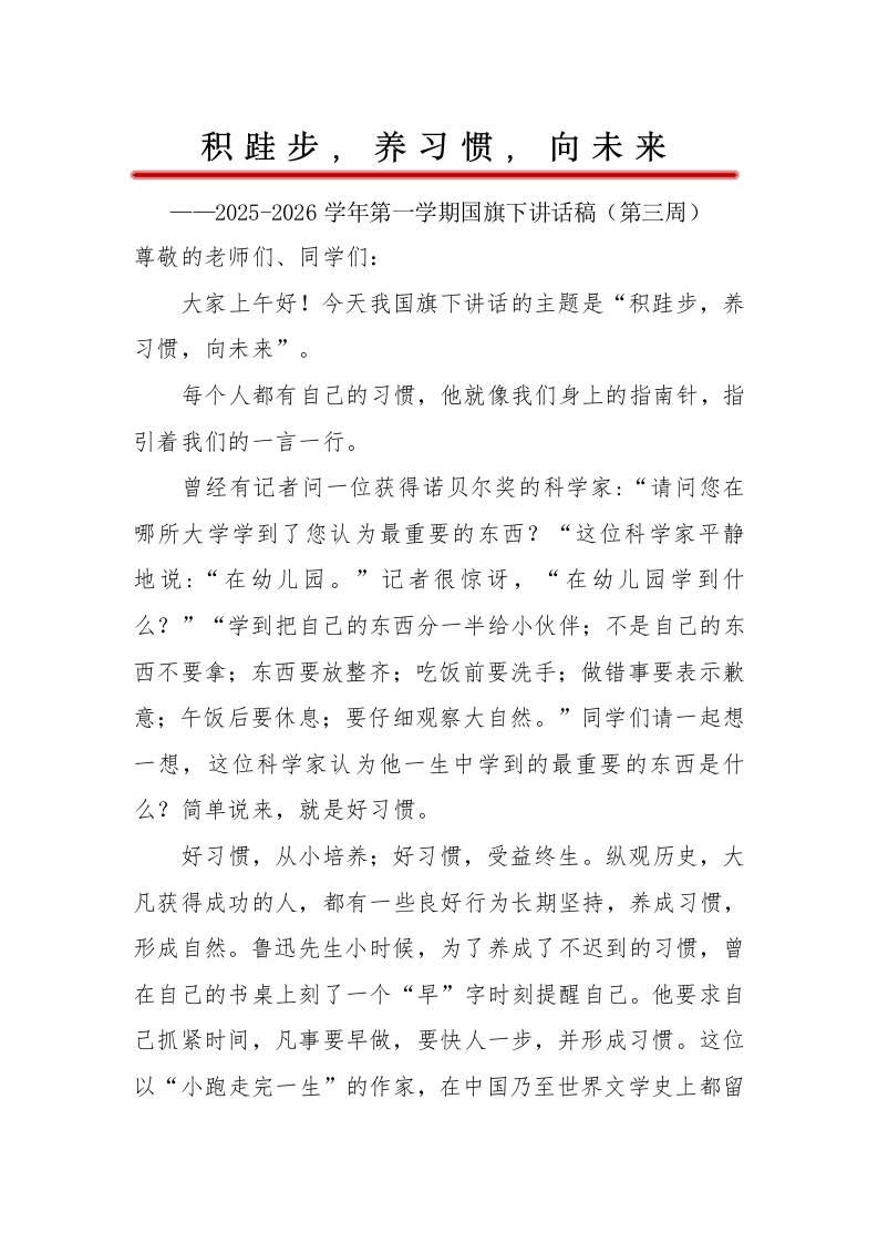 积跬步,养习惯,向未来2025-2026学年第一学期国旗下讲话稿(第三周)尊敬的老师们、同学们:大家上午好!今天我国旗下讲话的主题是“积跬步,养习惯,向未来”。每个人都有自己的习惯,他就像我们身上的指南针,指引着我们的一言一行。曾经有记者问一位获得诺贝尔奖的科学家:“请问您在哪所大学学到了您认为最重要的东西?“这位科学家平静地说:“在幼儿园。”记者很惊讶,“在幼儿园学到什么?”“学到把自己的东西分一半给小伙伴;不是自己的东西不要拿;东西要放整齐:吃饭前要洗手:做错事要表示歉意;午饭后要休息;要仔细观察大自然。”同学们请一起想一想,这位科学家认为他一生中学到的最重要的东西是什么?简单说来,就是好习惯。好习惯,从小培养;好习惯,受益终生。纵观历史,大凡获得成功的人,都有一些良好行为长期坚持,养成习惯,形成自然。鲁迅先生小时候,为了养成了不迟到的习惯,曾在自己的书桌上刻了一个“早”字时刻提醒自己。他要求自己抓紧时间,凡事要早做,要快人一步,并形成习惯。这位以“小跑走完一生”的作家,在中国乃至世界文学史上都留