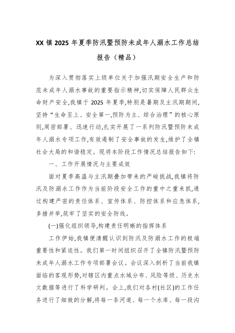 XX镇2025年夏季防汛暨预防未成年人溺水工作总结报告(精品)为深入贯彻落实上级单位关于加强汛期安全生产和防范未成年人溺水事故的重要指示精神,切实保障人民群众生命财产安全,我镇于2025年夏季,特别是暑期及主汛期期间,坚持“生命至上、安全第一,预防为主、综合治理”的核心原则,周密部署、迅速行动,扎实开展了一系列防汛暨预防未成年人溺水专项工作,有效遏制了安全事故的发生,维护了全镇社会大局的和谐稳定。现将本阶段工作情况总结报告如下:一、工作开展情况与主要成效面对夏季高温与主汛期叠加带来的严峻挑战,我镇将防汛及防溺水工作作为当前阶段安全工作的重中之重来抓,通过构建严密的责任体系、宣传体系、防控体系和应急体系,多措并举,筑牢了坚实的安全防线。(一)强化组织领导,构建责任明晰的指挥体系工作伊始,我镇便清醒认识到防汛及防溺水工作的极端重要性和紧迫性。我们第一时间组织召开了全镇防汛暨预防未成年人溺水工作专项部署会议。会议深入剖析了当前我镇面临的客观形势,对辖区内重点水域分布、风险等级、历史水文数据等进行了科学研判。会上,我们对各村(社区)的工作任务进行了细致的分解,将每一条河道、每一个水库、每一段沟