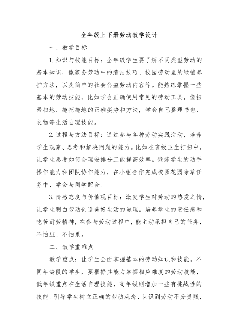 全年级上下册劳动教学设计一、教学目标1.知识与技能目标:全年级学生要了解不同类型劳动的基本知识,像家务劳动中的清洁技巧、校园劳动里的绿植养护方法,以及简单的社会公益劳动内容等。能熟练掌握一些基本的劳动技能,比如学会正确使用常见的劳动工具,像扫帚扫地、拖把拖地的正确姿势和方法,学会自己整理书包、衣物等生活自理技能。2.过程与方法目标:通过参与各种劳动实践活动,培养学生观察、思考和解决问题的能力。比如在班级卫生打扫中,让学生思考如何合理安排分工能提高效率。锻炼学生的动手操作能力和团队协作能力,在小组合作完成校园花园除草任务中,学会与同学配合。3.情感态度与价值观目标:激发学生对劳动的热爱之情,让学生明白劳动创造美好生活的道理。培养学生的责任感和吃苦耐劳精神,在参与劳动过程中,能主动承担自己的任务,不怕脏、不怕累。二、教学重难点教学重点:让学生全面掌握基本的劳动知识和技能。不同年龄段的学生,要根据其能力掌握相应难度的劳动技能,低年级重点在生活自理技能,高年级则增加一些有挑战性的技能。引导学生树立正确的劳动观念,认识到劳动不分贵贱,