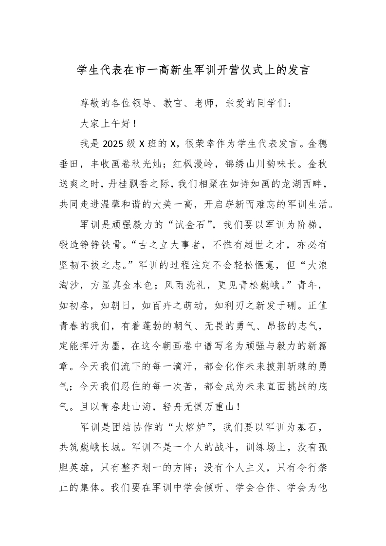 学生代表在市一高新生军训开营仪式上的发言尊敬的各位领导、教官、老师,亲爱的同学们:大家上午好!我是2025级X班的X,很荣幸作为学生代表发言。金穗垂田,丰收画卷秋光灿;红枫漫岭,锦绣山川韵味长。金秋送爽之时,丹桂飘香之际,我们相聚在如诗如画的龙湖西畔,共同走进温馨和谐的大美一高,开启崭新而难忘的军训生活。军训是顽强毅力的“试金石”,我们要以军训为阶梯,锻造铮铮铁骨。“古之立大事者,不惟有超世之才,亦必有坚韧不拔之志。”军训的过程注定不会轻松惬意,但“大浪淘沙,方显真金本色;风雨洗礼,更见青松巍峨。”青年,如初春,如朝日,如百卉之萌动,如利刃之新发于硎。正值青春的我们,有着蓬勃的朝气、无畏的勇气、昂扬的志气,定能挥汗为墨,在这今朝画卷中谱写名为顽强与毅力的新篇章。今天我们流下的每一滴汗,都会化作未来披荆斩棘的勇气:今天我们忍住的每一次苦,都会成为未来直面挑战的底气。且以青春赴山海,轻舟无惧万重山!军训是团结协作的“大熔炉”,我们要以军训为基石,共筑巍峨长城。军训不是一个人的战斗,训练场上,没有孤胆英雄,只有整齐划一的方阵:没有个人主义,只有令行禁止的集体。我们要在军训中学会倾听、学会合作、学会为他