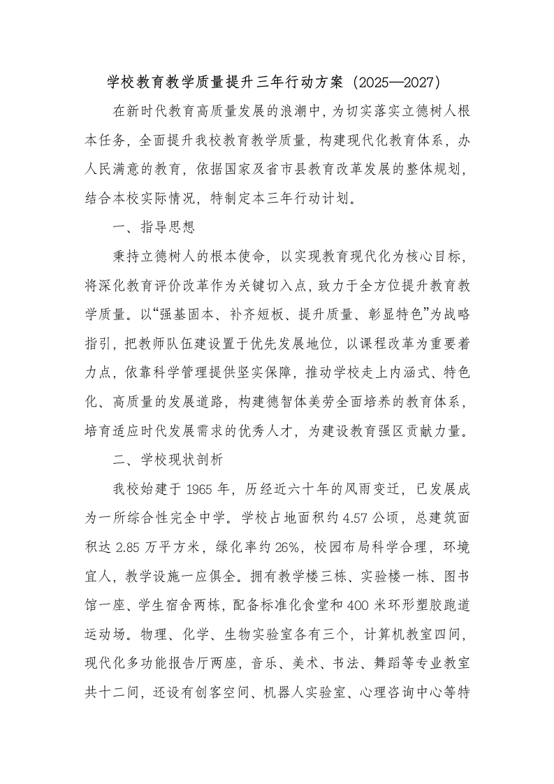 学校教育教学质量提升三年行动方案(2025一2027)在新时代教育高质量发展的浪潮中,为切实落实立德树人根本任务,全面提升我校教育教学质量,构建现代化教育体系,办人民满意的教育,依据国家及省市县教育改革发展的整体规划,结合本校实际情况,特制定本三年行动计划。一、指导思想秉持立德树人的根本使命,以实现教育现代化为核心目标,将深化教育评价改革作为关键切入点,致力于全方位提升教育教学质量。以“强基固本、补齐短板、提升质量、彰显特色”为战略指引,把教师队伍建设置于优先发展地位,以课程改革为重要着力点,依靠科学管理提供坚实保障,推动学校走上内涵式、特色化、高质量的发展道路,构建德智体美劳全面培养的教育体系,培育适应时代发展需求的优秀人才,为建设教育强区贡献力量。二、学校现状剖析我校始建于1965年,历经近六十年的风雨变迁,已发展成为一所综合性完全中学。学校占地面积约4.57公顷,总建筑面积达2.85万平方米,绿化率约26%,校园布局科学合理,环境宜人,教学设施一应俱全。拥有教学楼三栋、实验楼一栋、图书馆一座、学生宿舍两栋,配备标准化食堂和400米环形塑胶跑道运动场。物理、化学、生物实验室各有三个,计算机教室四间,现代化多功能报告厅两座,音乐、美术、书法、舞蹈等专业教室共十二间,还设有创客空间、机器人实验室、心理咨询中心等特