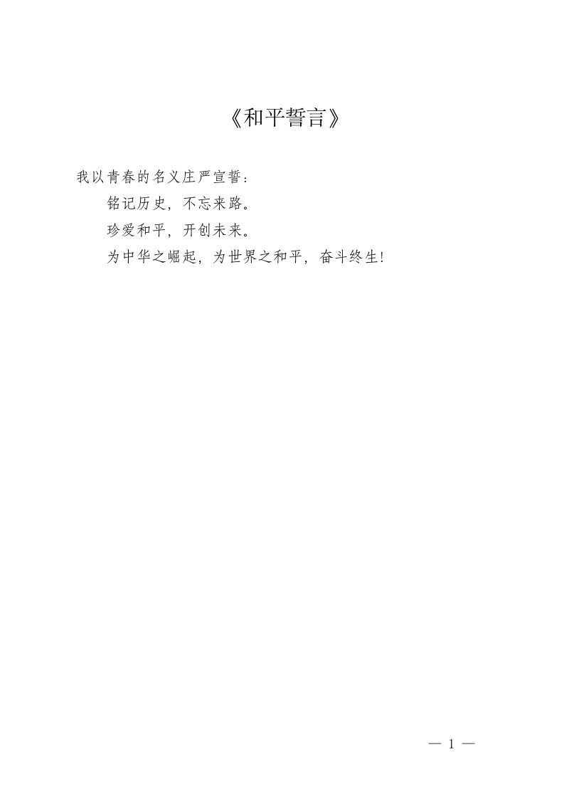 《和平誓言》我以青春的名义庄严宣誓:铭记历史,不忘来路。珍爱和平,开创未来。为中华之崛起,为世界之和平,奋斗终生!1