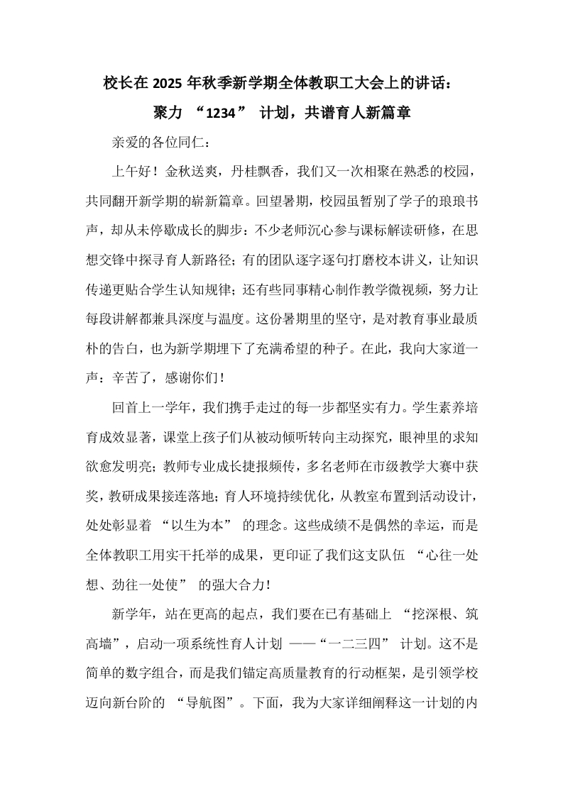 校长在2025年秋季新学期全体教职工大会上的讲话:聚力“1234”计划,共谱育人新篇章亲爱的各位同仁:上午好!金秋送爽,丹桂飘香,我们又一次相聚在熟悉的校园,共同翻开新学期的崭新篇章。回望暑期,校园虽暂别了学子的琅琅书声,却从未停歇成长的脚步:不少老师沉心参与课标解读研修,在思想交锋中探寻育人新路径;有的团队逐字逐句打磨校本讲义,让知识传递更贴合学生认知规律:还有些同事精心制作教学微视频,努力让每段讲解都兼具深度与温度。这份暑期里的坚守,是对教育事业最质朴的告白,也为新学期埋下了充满希望的种子。在此,我向大家道一声:辛苦了,感谢你们!回首上一学年,我们携手走过的每一步都坚实有力。学生素养培育成效显著,课堂上孩子们从被动倾听转向主动探究,眼神里的求知欲愈发明亮:教师专业成长捷报频传,多名老师在市级教学大赛中获奖,教研成果接连落地:育人环境持续优化,从教室布置到活动设计,处处彰显着“以生为本”的理念。这些成绩不是偶然的幸运,而是全体教职工用实干托举的成果,更印证了我们这支队伍“心往一处想、劲往一处使”的强大合力!新学年,站在更高的起点,我们要在已有基础上“挖深根、筑高墙”,启动一项系统性育人计划一一“一二三四”计划。这不是简单的数字组合,而是我们锚定高质量教育的行动框架,是引领学校迈向新台阶的“导航图”。下面,我为大家详细阐释这一计划的内